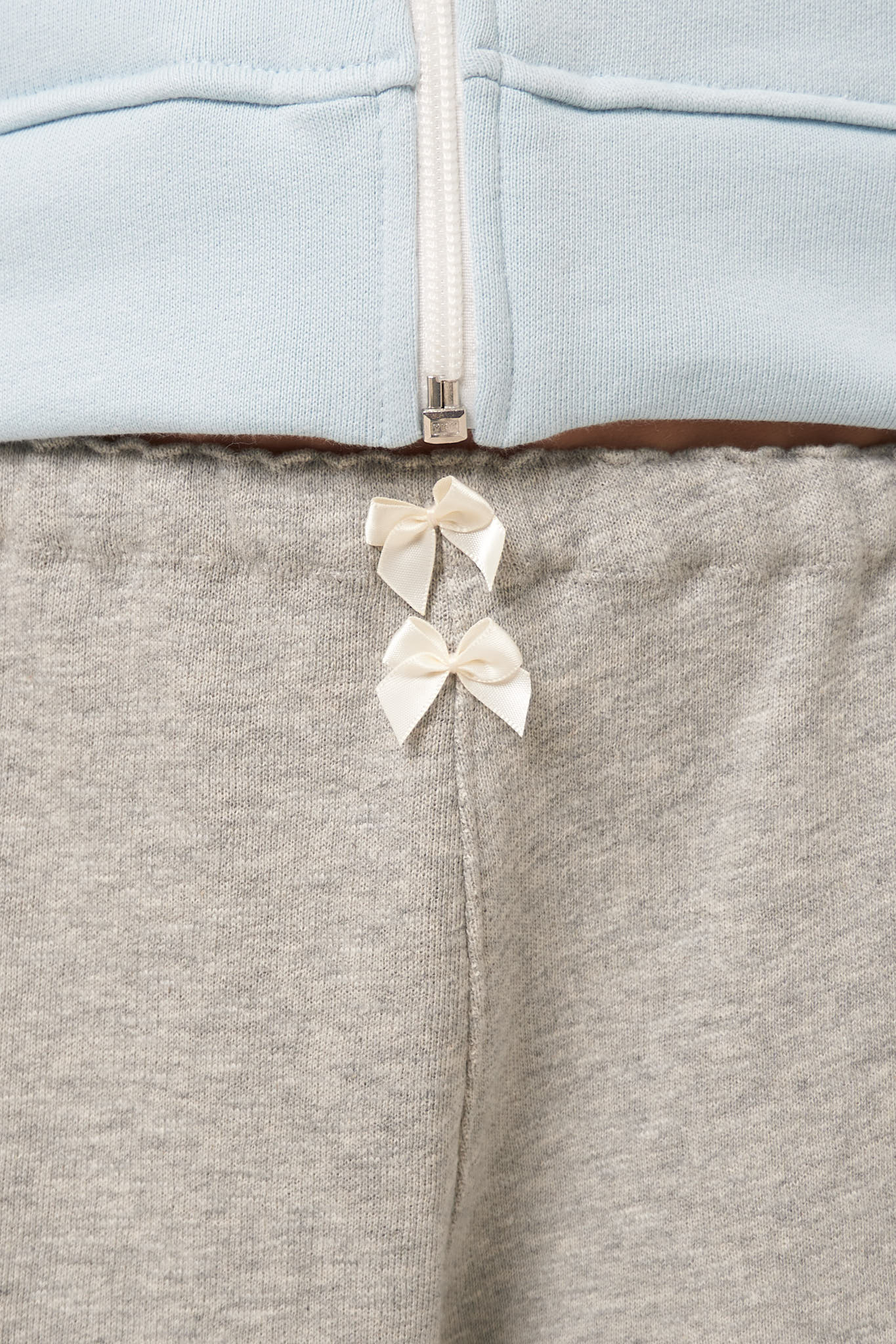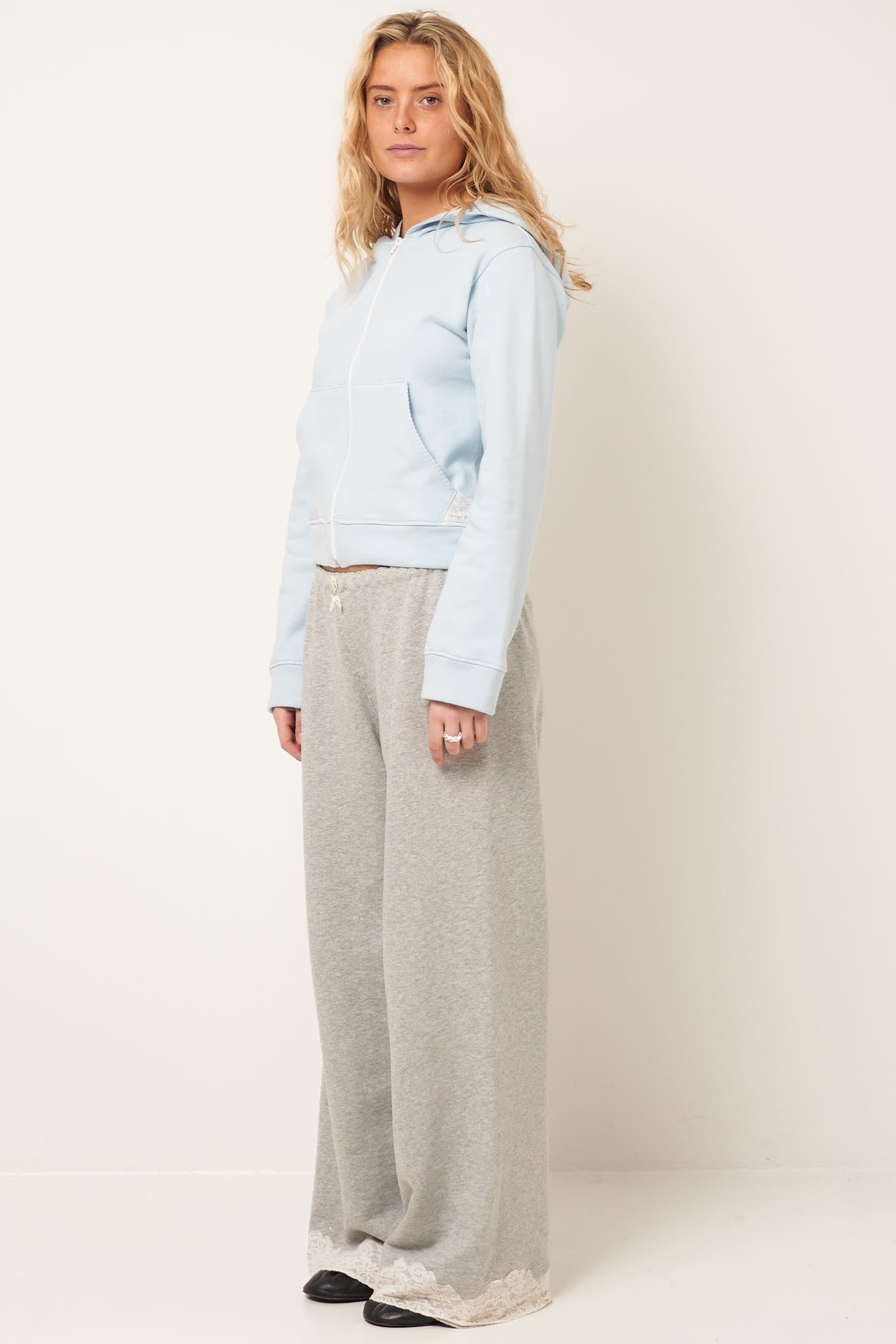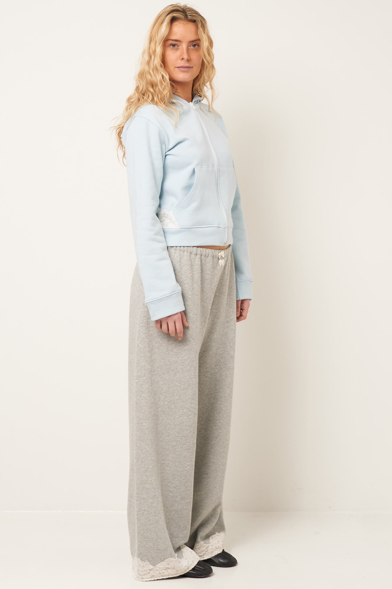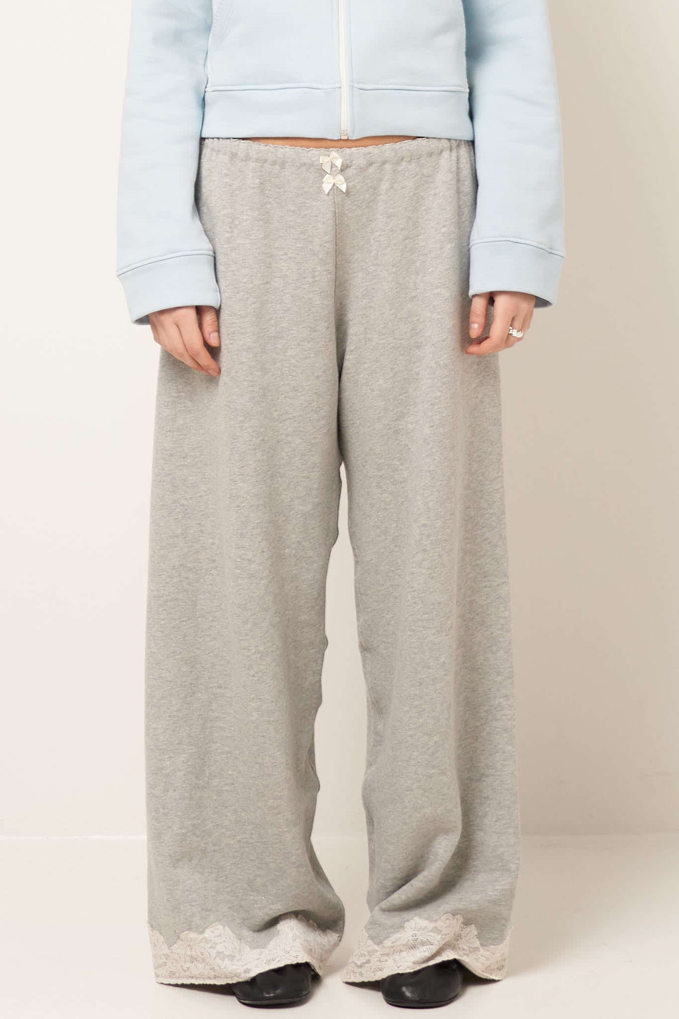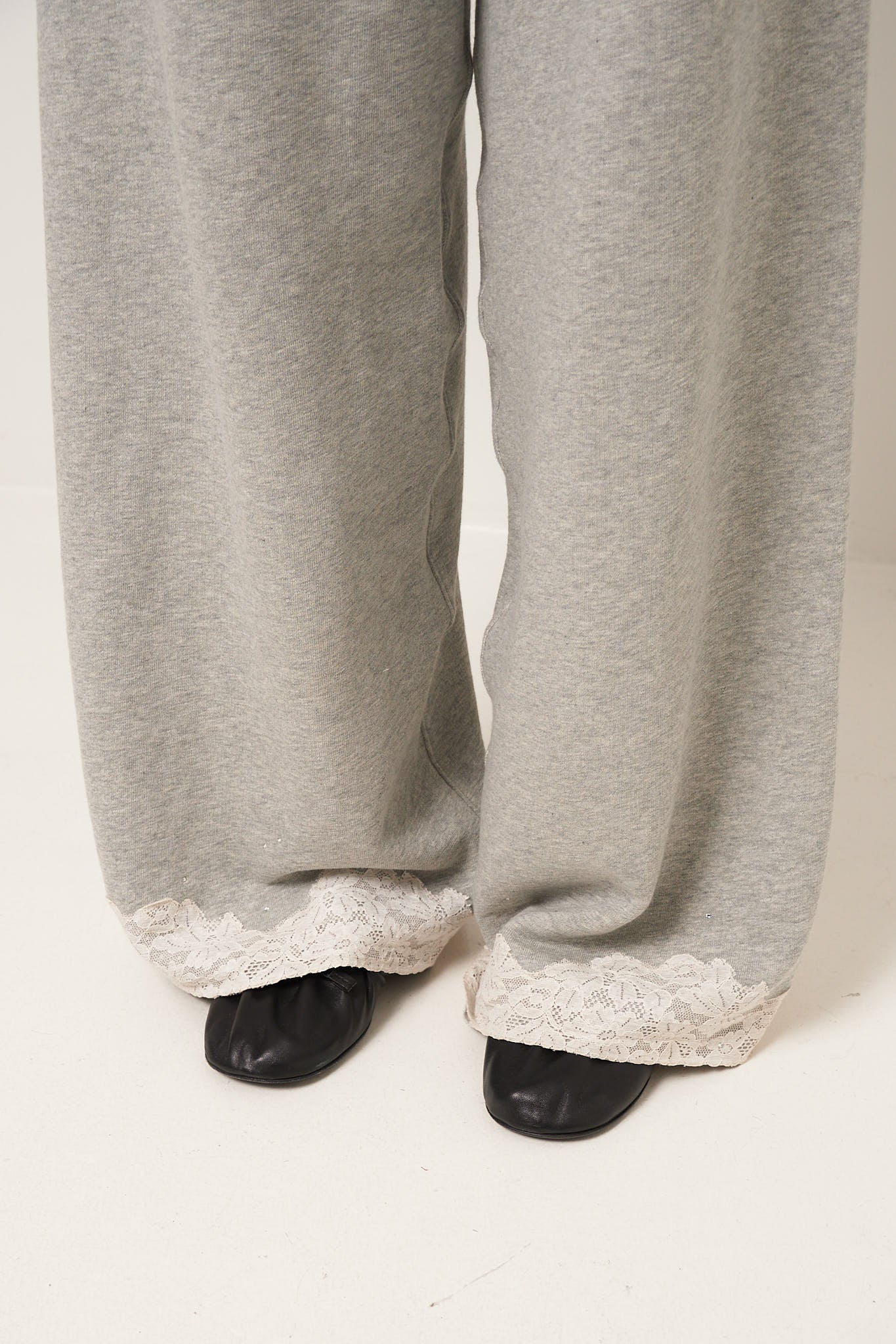 Lace Sweatpants Light Gray Melange gra gabi gamél. These sweatpants are made from a strong cotton and produced from deadstock metre. They have a low-waisted fit with an elasticated waist and wide legs. These sweatpants are designed with two bows in the front, French vintage lace and Swarovski rhinestones at the bottom of the legs.