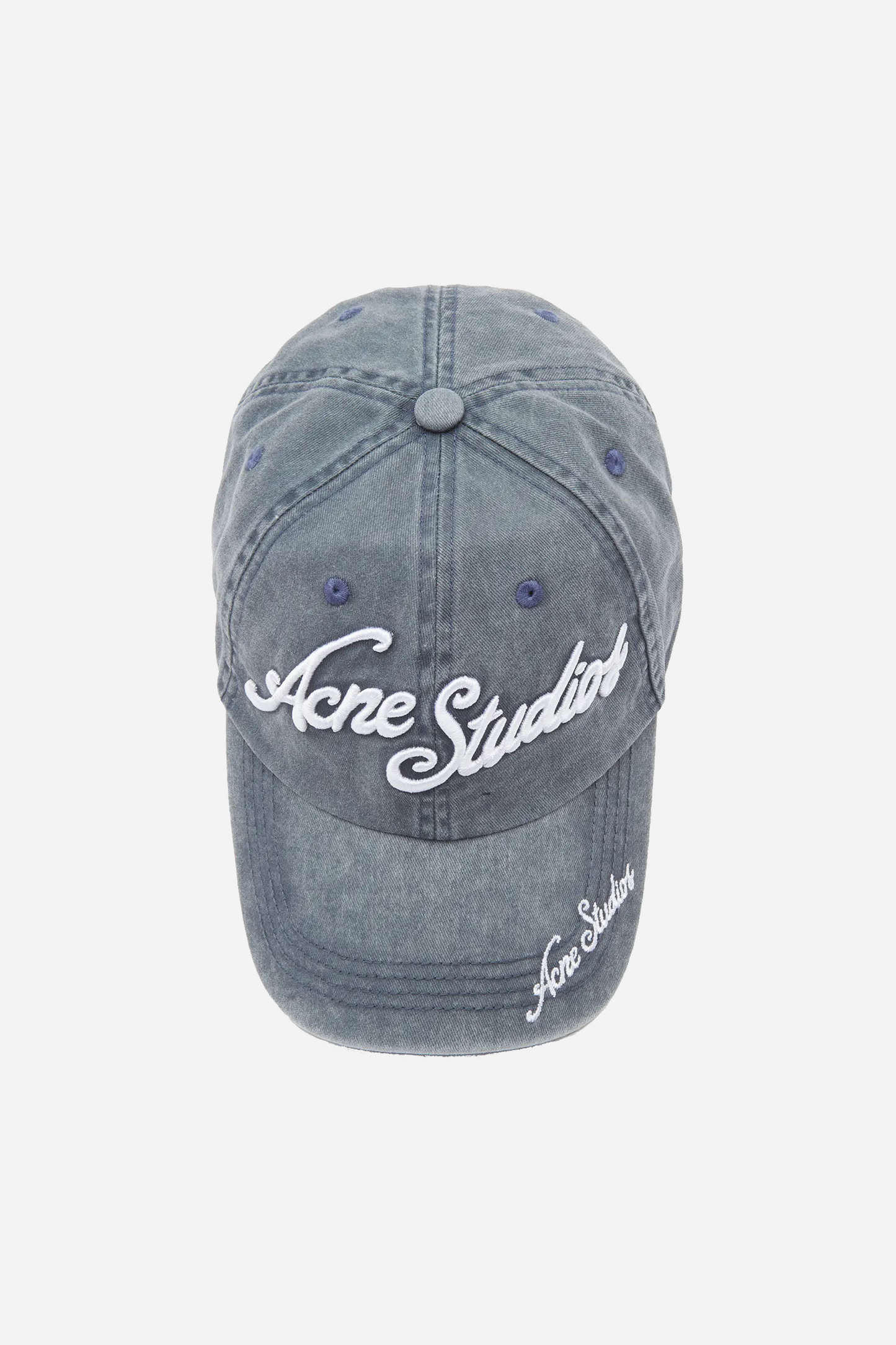 Logo Cap Faded Blue from Acne Studios. This cap is made of cotton. It is designed with an Acne Studios logo on the front and on the brim. The cap can be adjusted at the back.