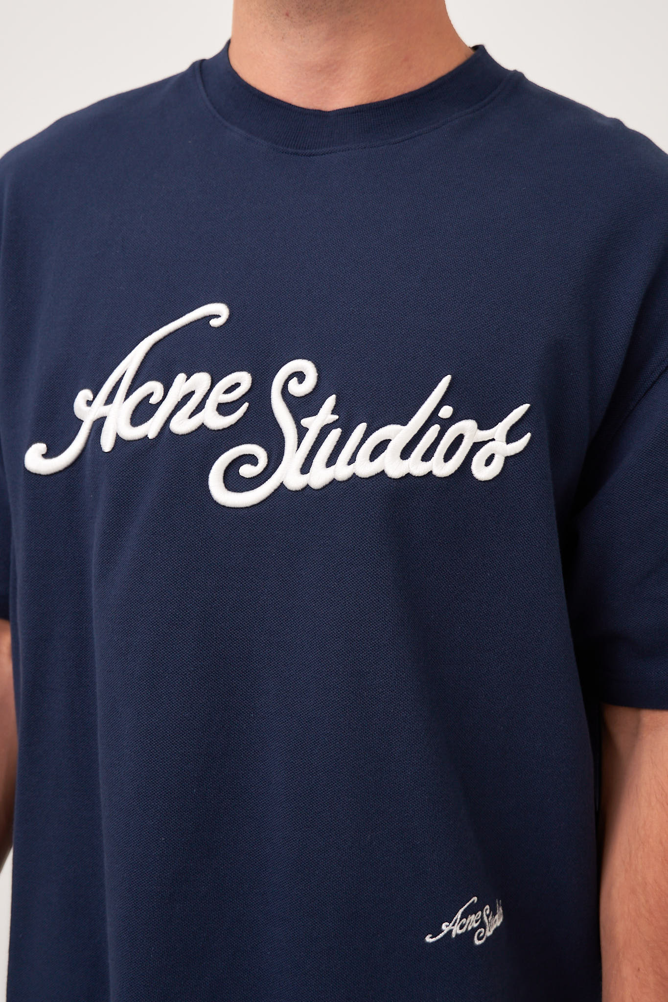 Logo T-Shirt Deep Blue from Acne Studios. This t-shirt is made from a textured cotton. It has a relaxed fit with a round neckline and short sleeves. The t-shirt has a larger Acne Studios logo on the chest and a smaller logo at the bottom.