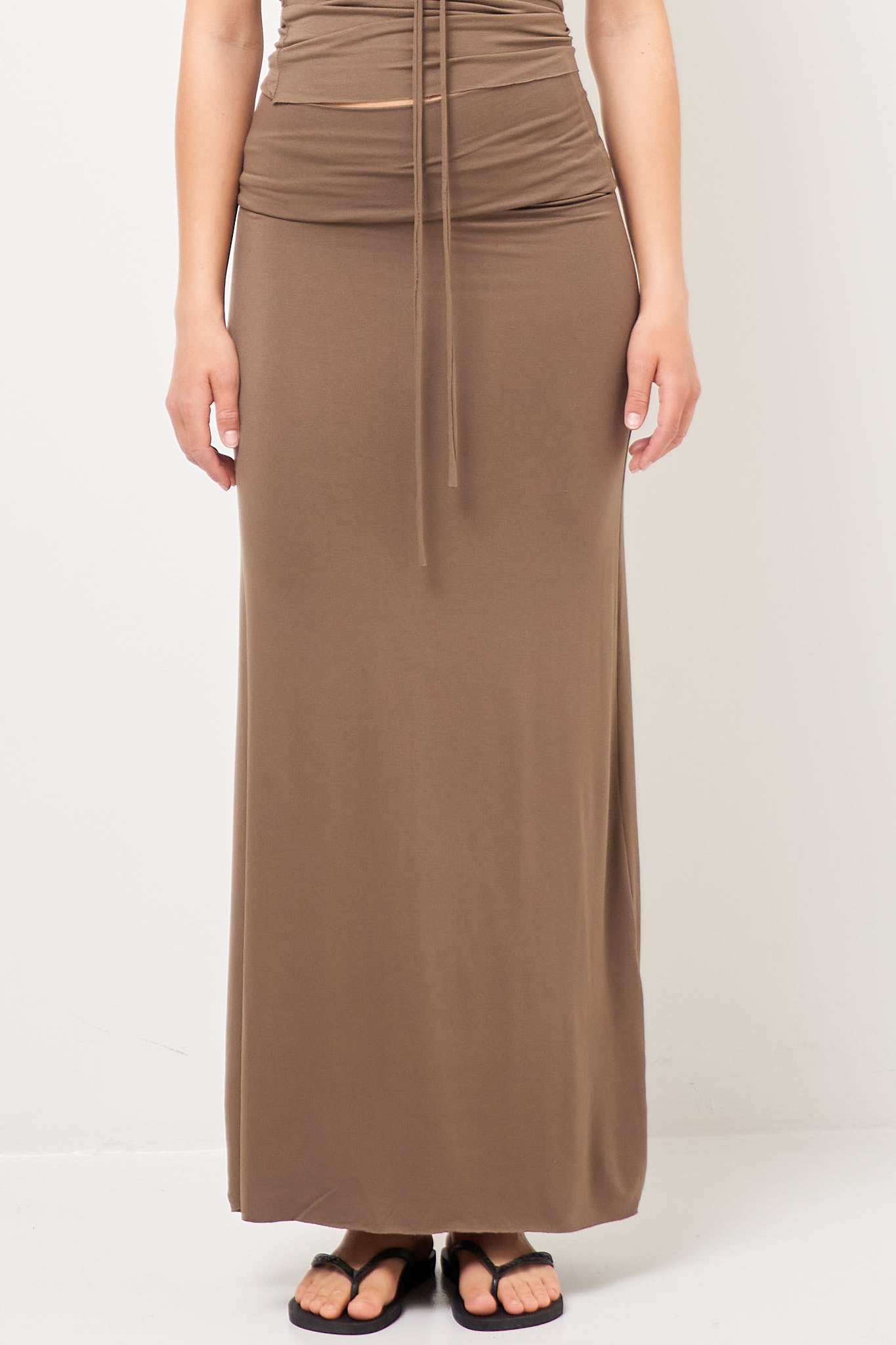 Long Skirt Olive from gabi gamel. This skirt is made of a stretchy viscose blend. It is designed with raw lengths and can be worn as both a dress and a skirt.