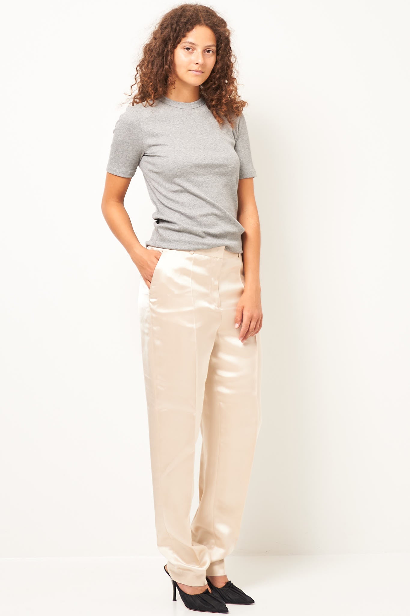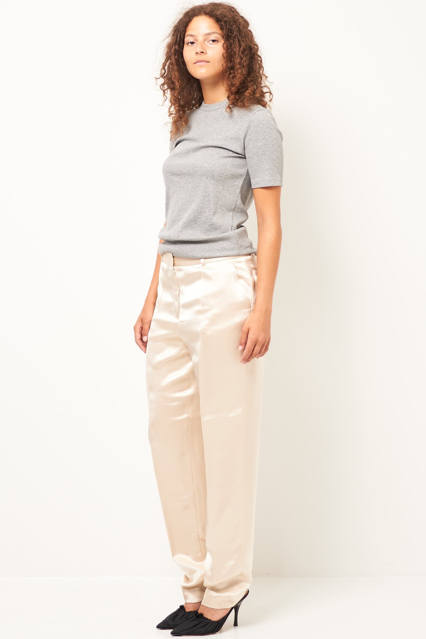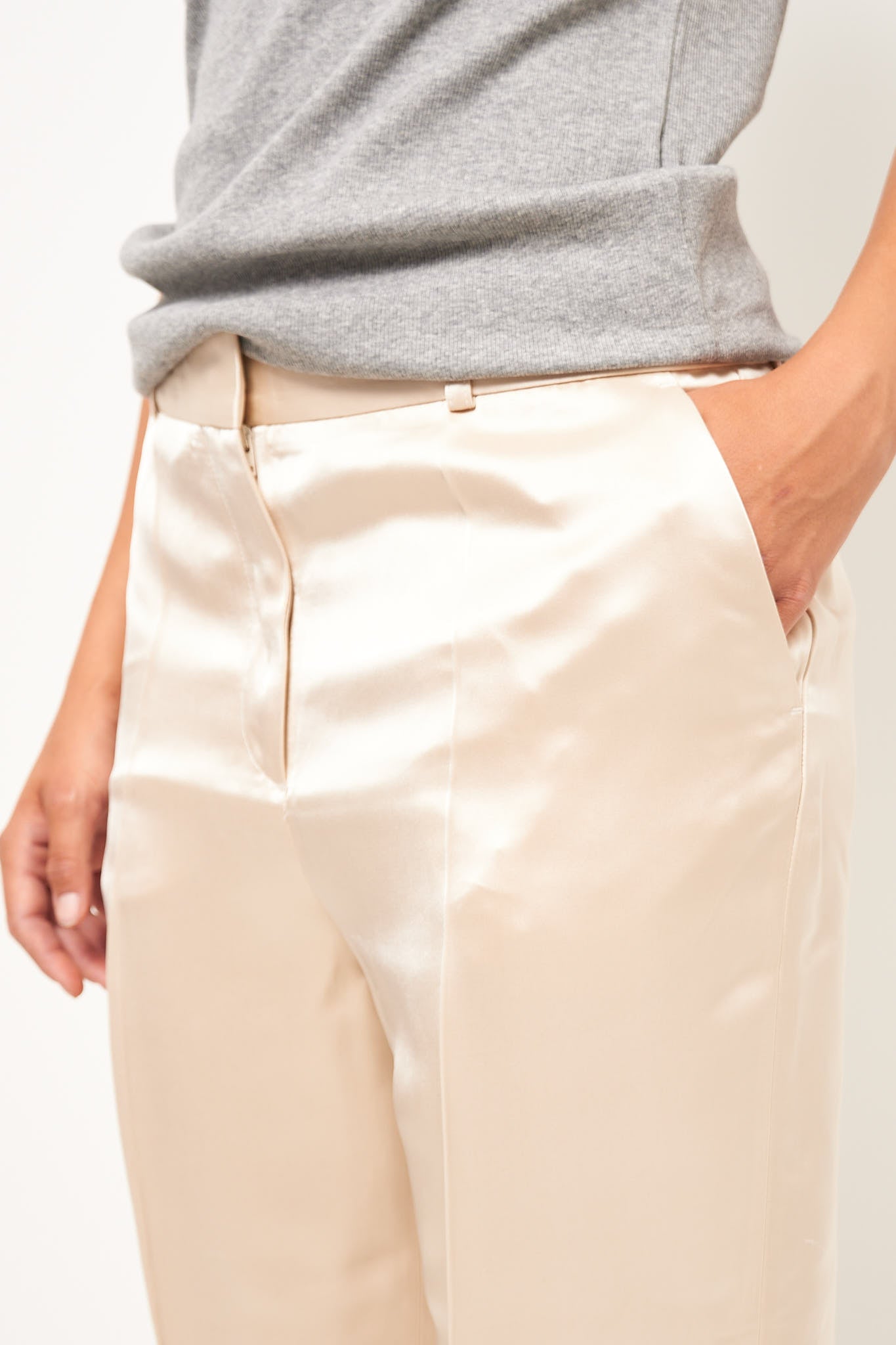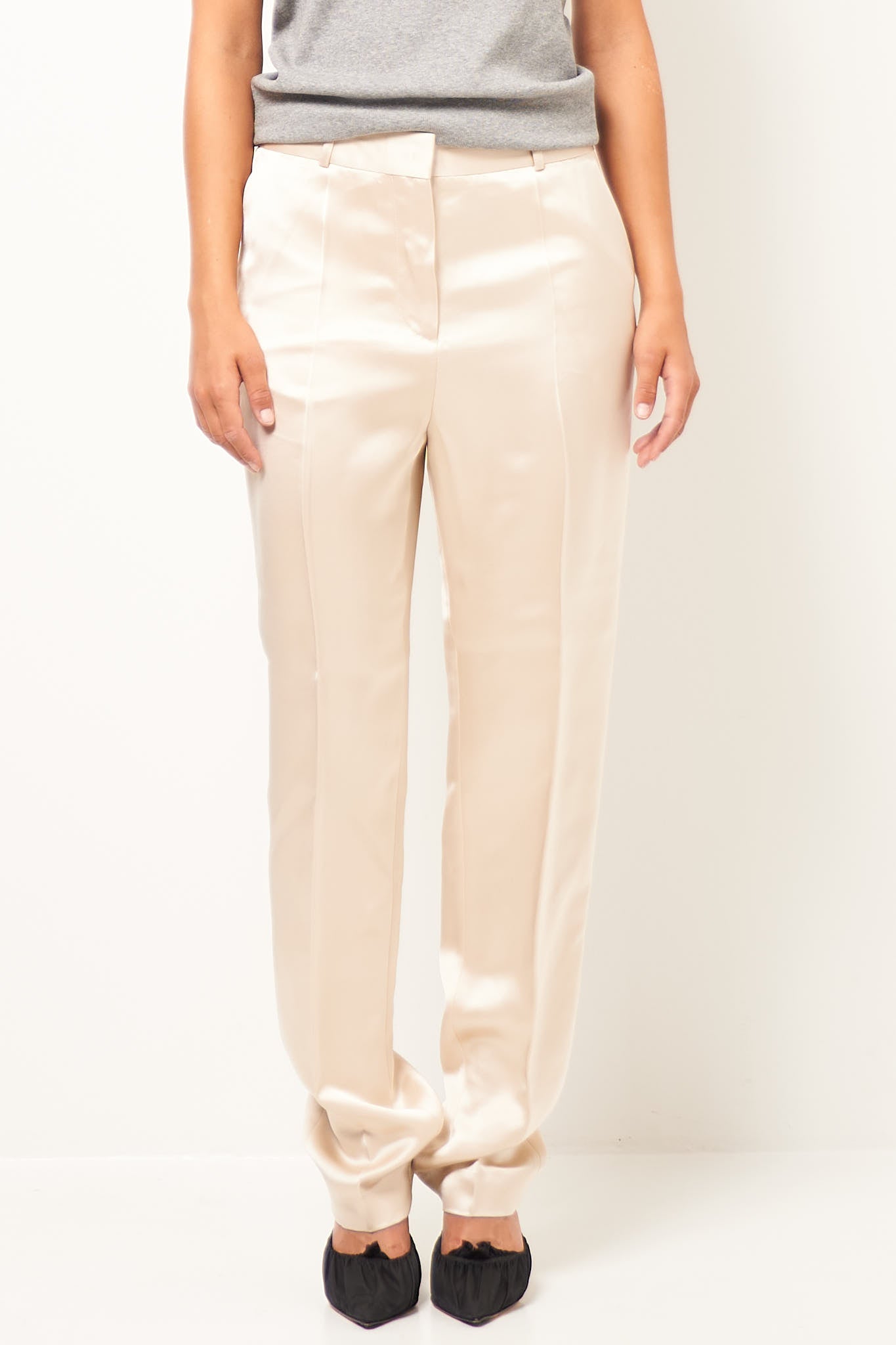 Low-Waist Satin Trousers Ecru from TOTEME. These pants are made from a viscose with a satin look. They are designed in a cigarette silhouette with a low waist. The pants have belt loops, side and back pockets and are closed with a zipper closure.