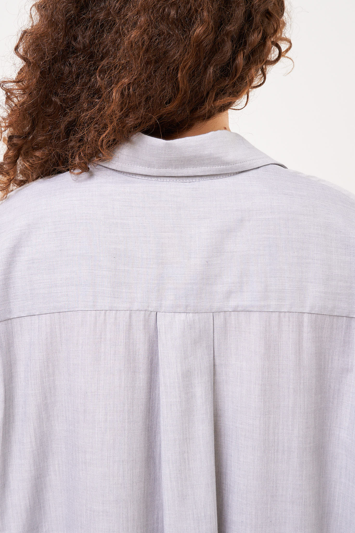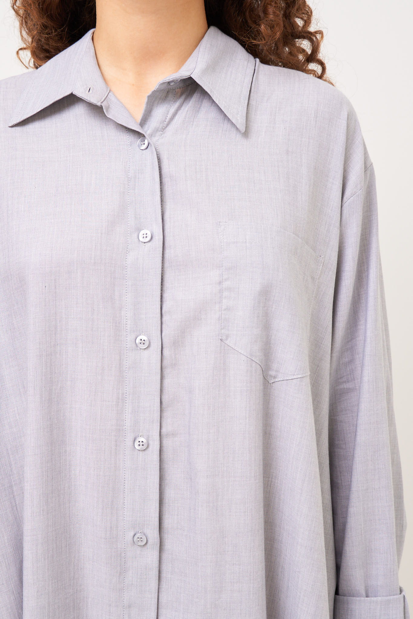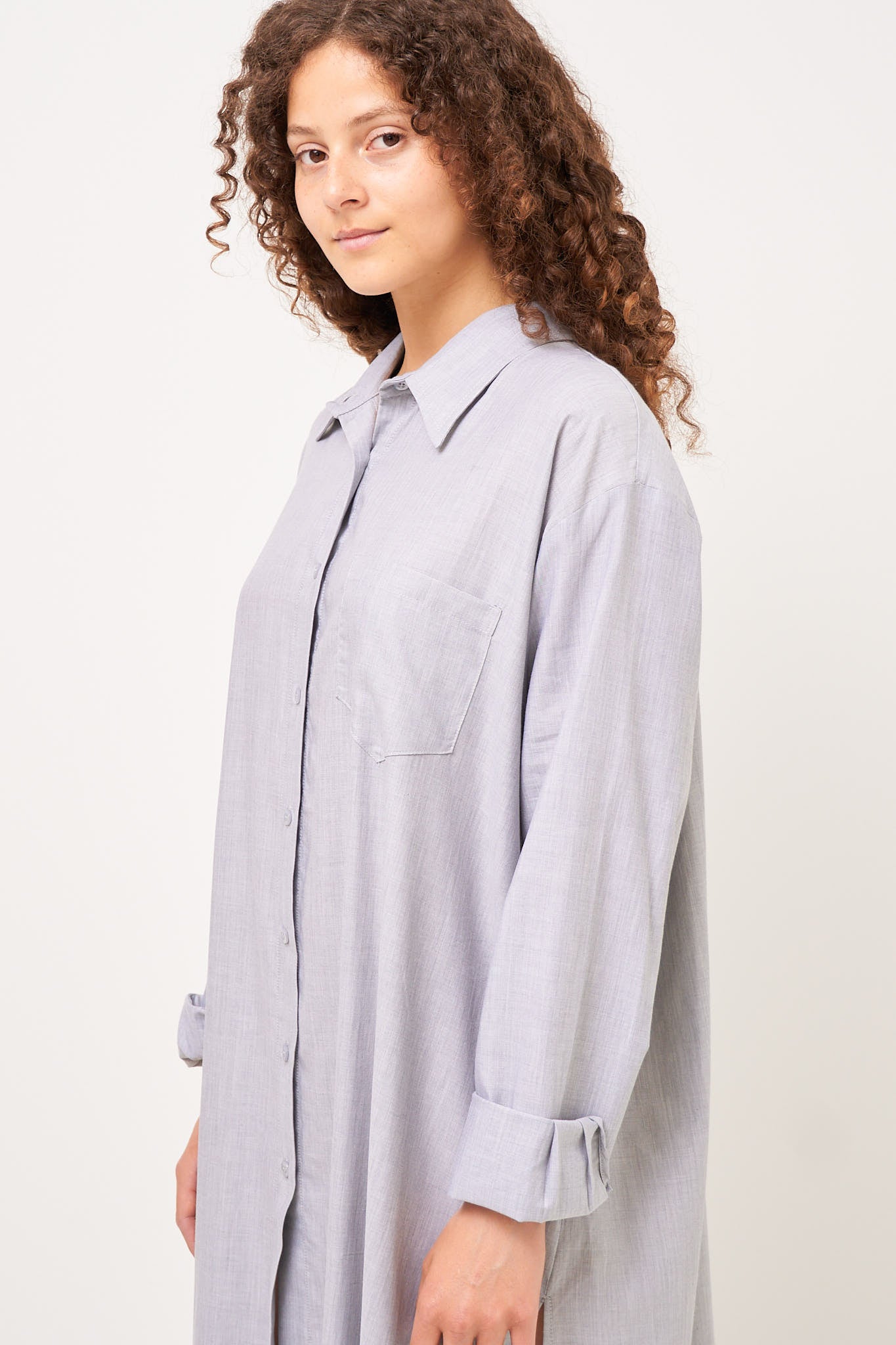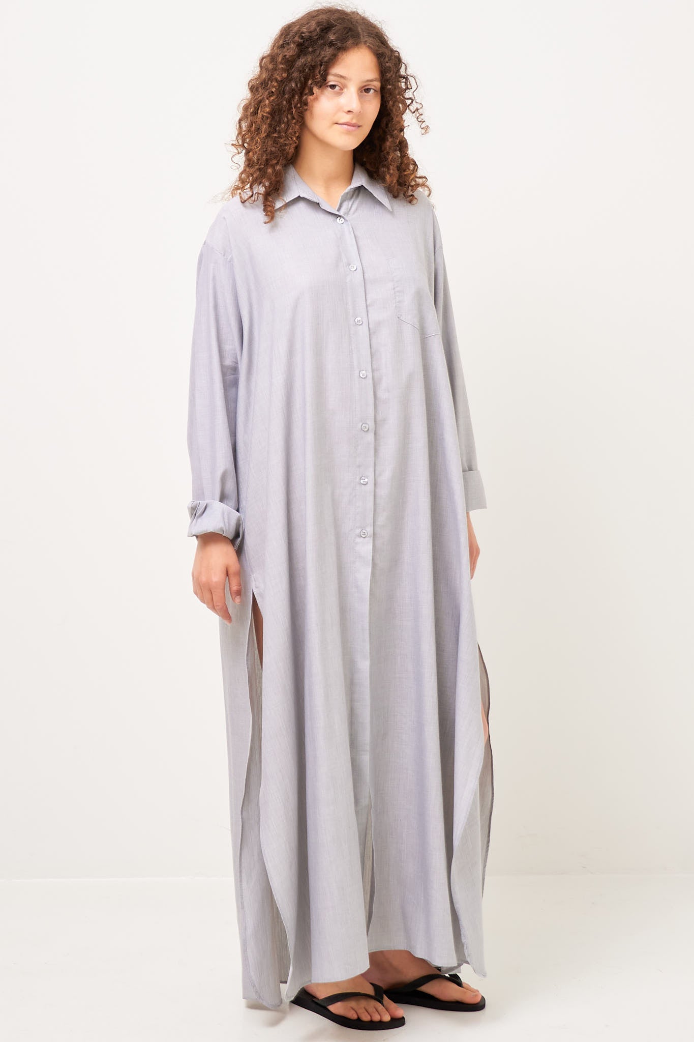 Marrakech Shirt Cashmere Grey from STRØM. This long shirt dress is made from a cashmere blend. It is designed in a relaxed fit with high slits, a chest pocket and closes with buttons.