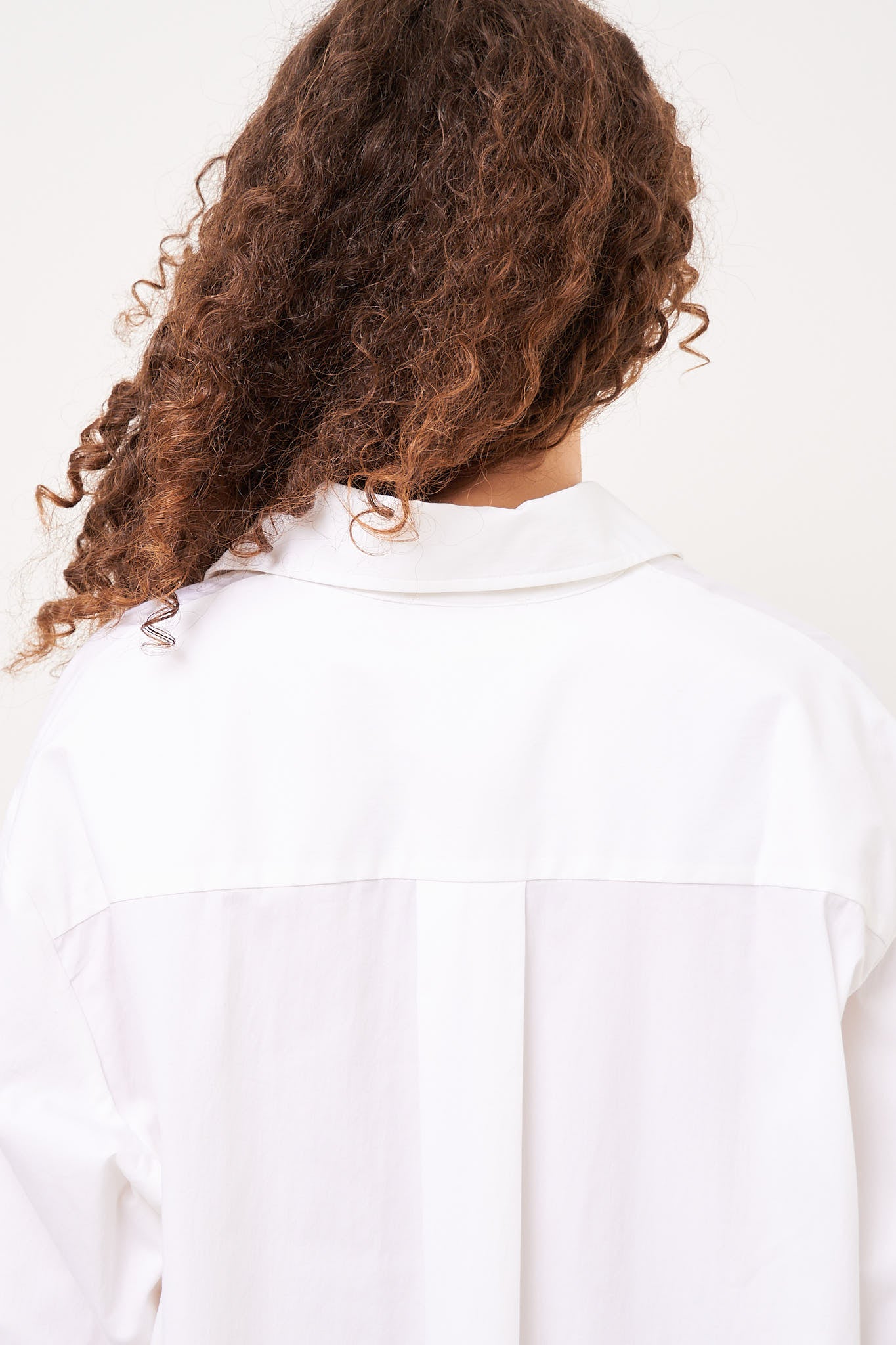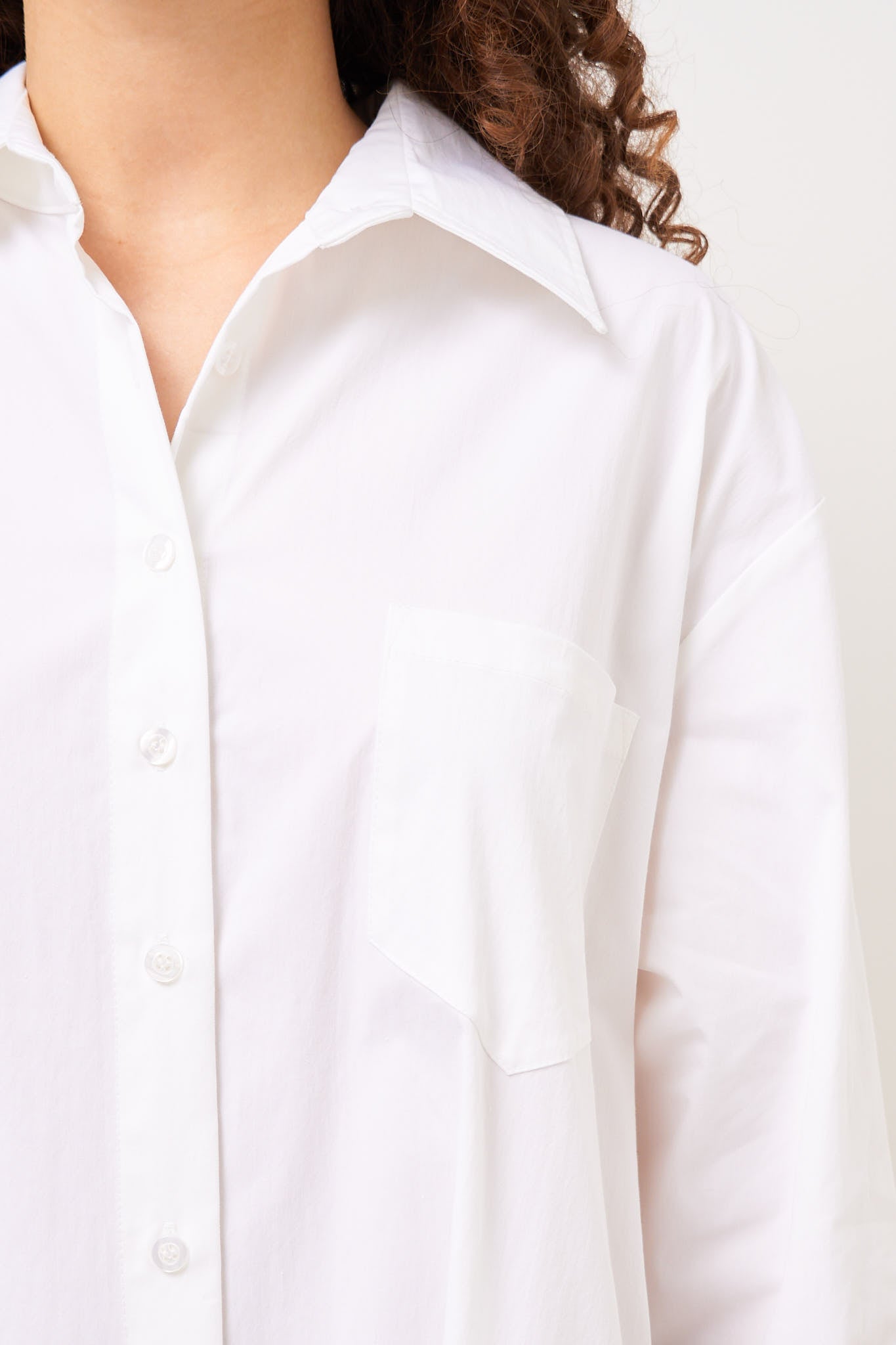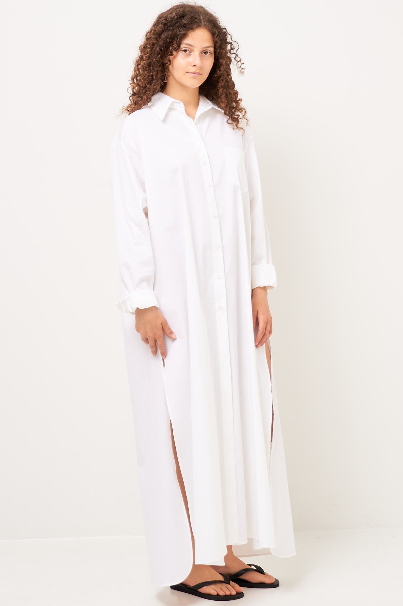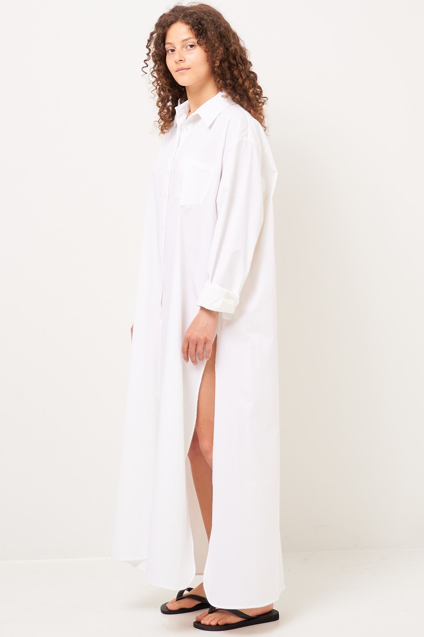 Marrakech Shirt White from STRØM. This long shirt dress is made from a cashmere blend. It is designed in a relaxed fit with high slits, a chest pocket and closes with buttons.