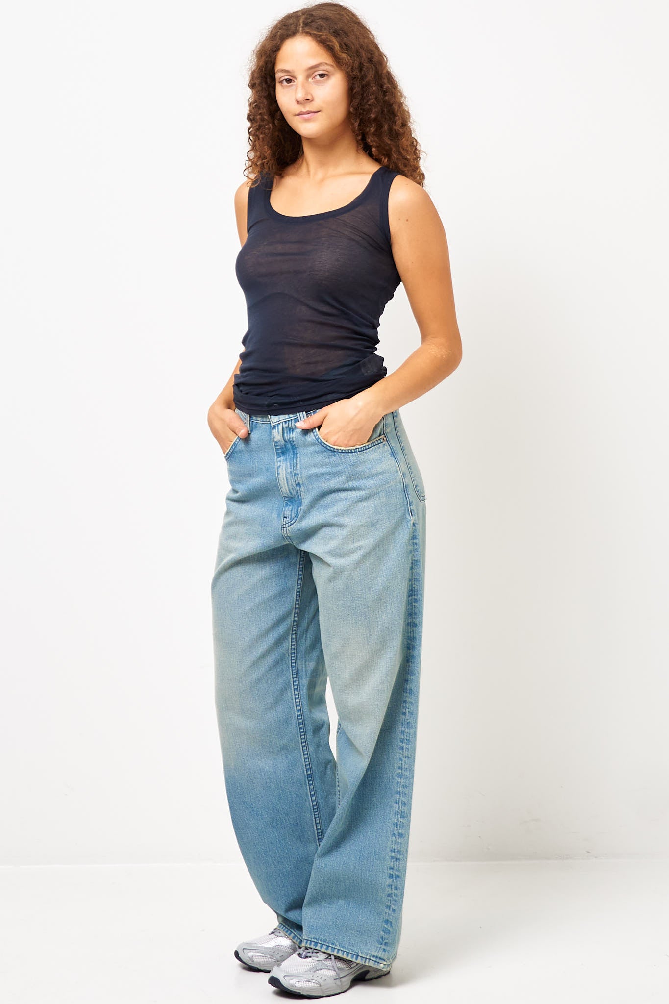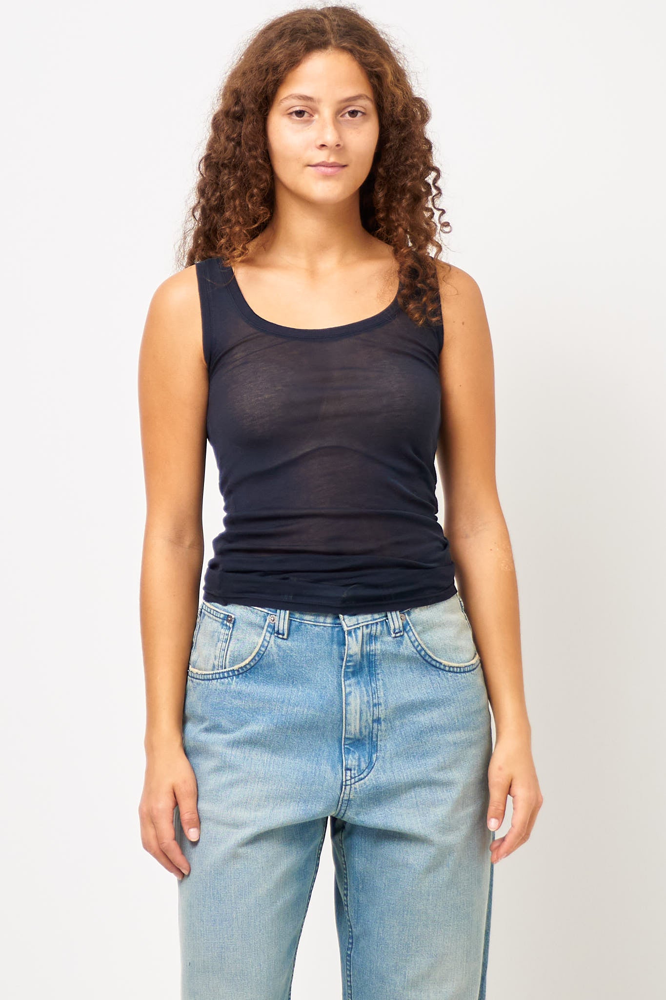 Massachusetts Top Navy from American Vintage. This top is made of cotton. It is designed with a deep round neckline, wide straps and has a tight fit.