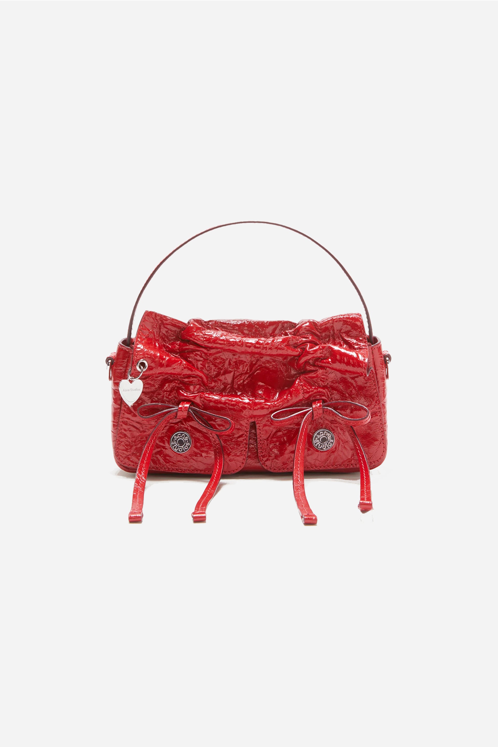 Multipocket Micro Bag Red from Acne Studios. This bag is made of calf leather. It is designed with two bows on the front, a heart-shaped metal pendant on the right side and an Acne Studios logo on the top of the handle. The bag has a removable strap and closes with two magnets on the front.