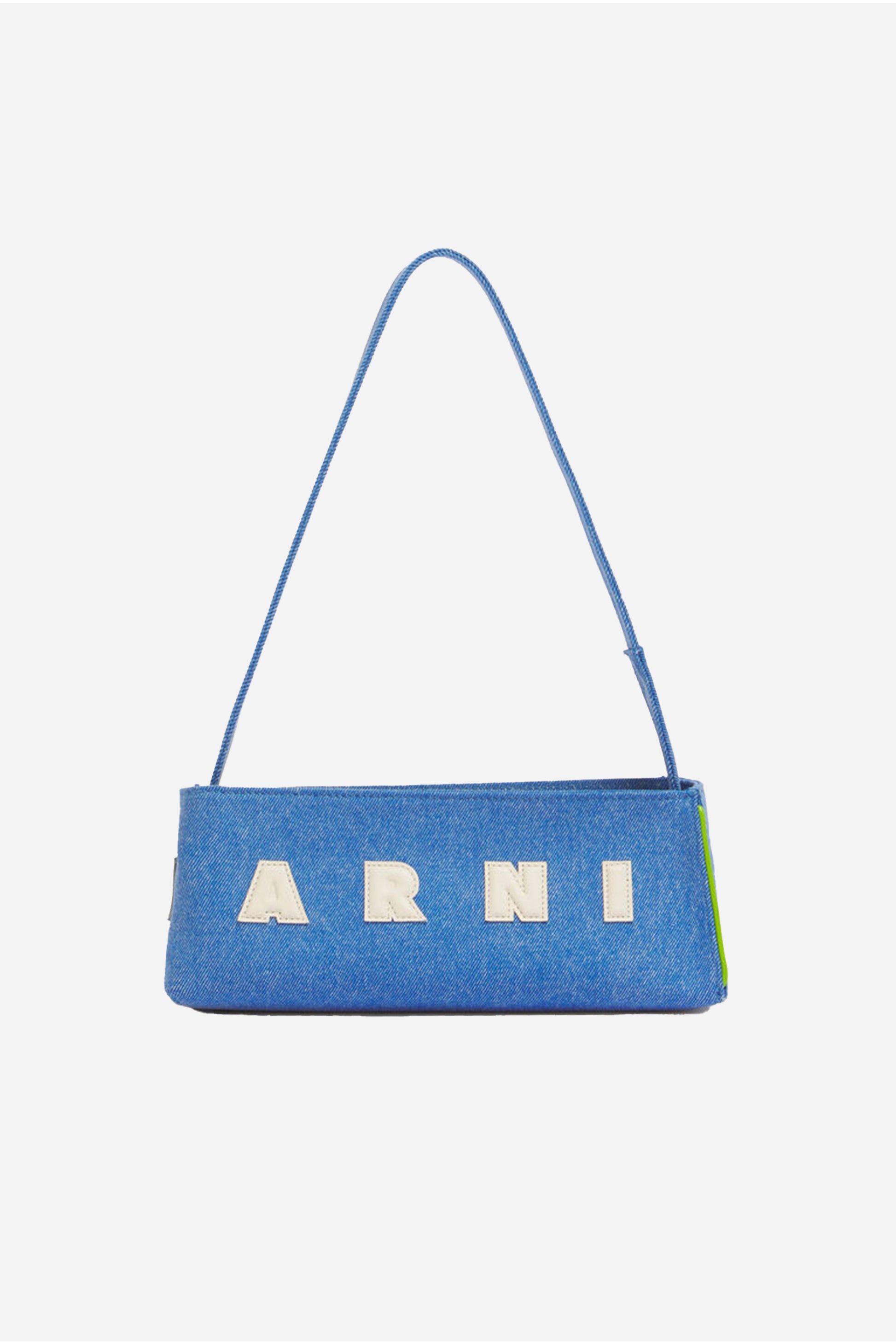 Denim Shopping Bag from Marni. This bag is made from organic denim. It is designed with contrasting lime green leather trim and a puffy Marni logo on the front. The bag has a soft drill lining, adjustable buckle on the handle and a zip closure.