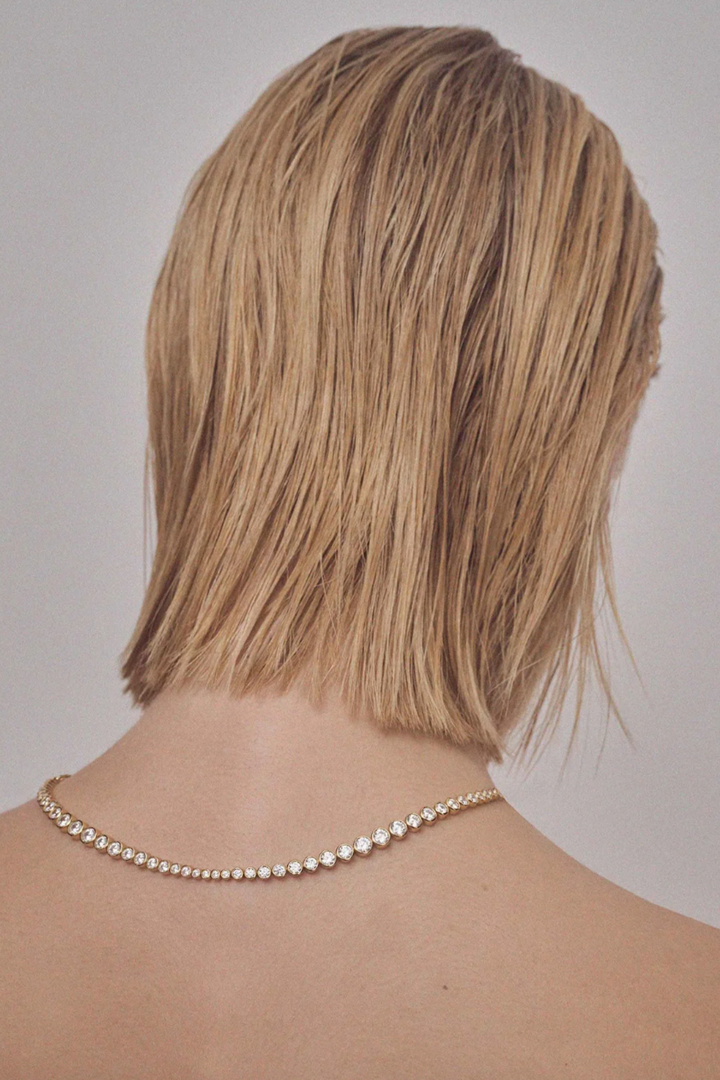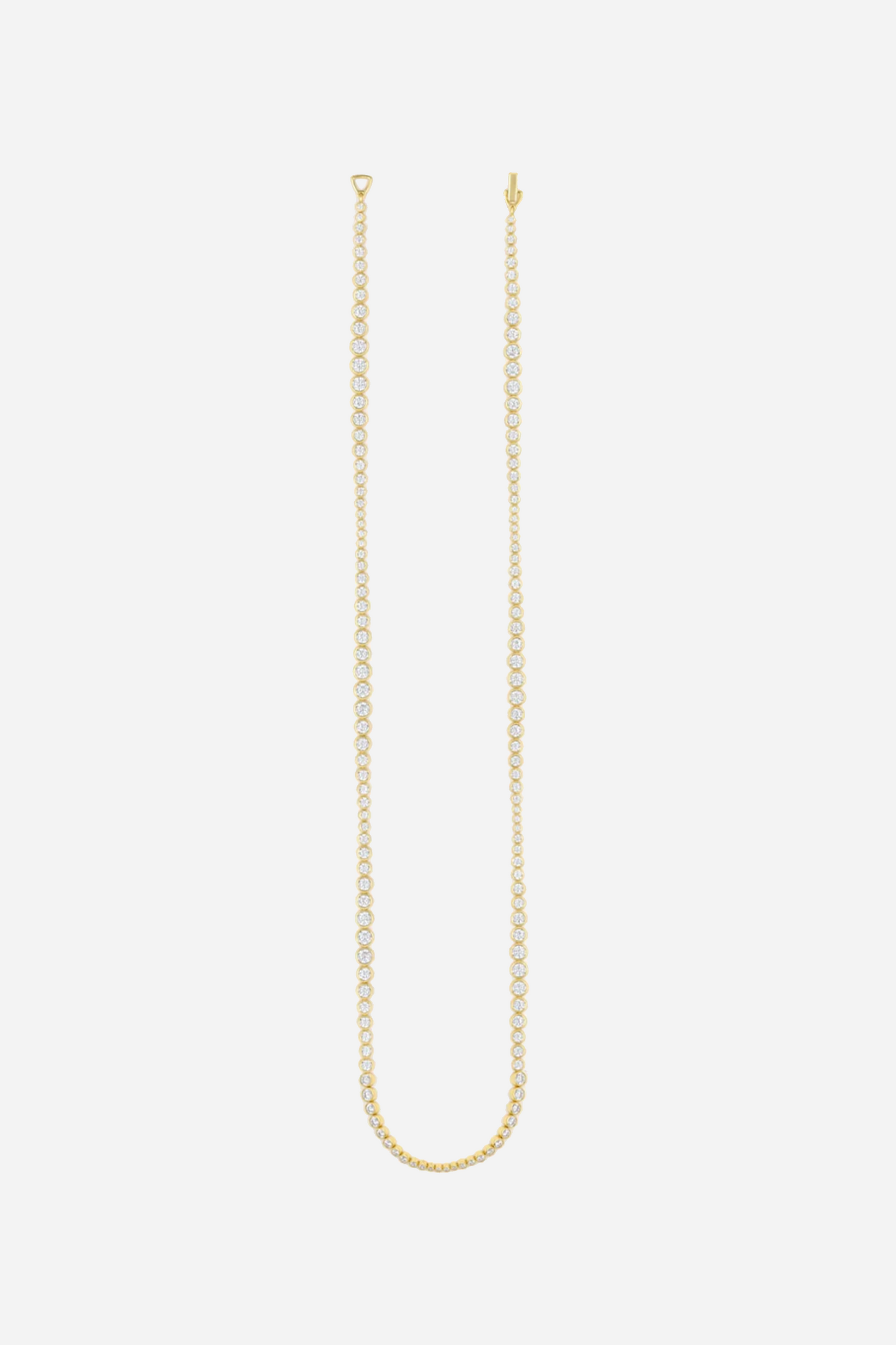 Oda Necklace from Ragbag. This necklace is made of sterling silver and plated with 18 karat gold plating. It is designed with stones in different sizes and a Ragbag logo at the clasp.