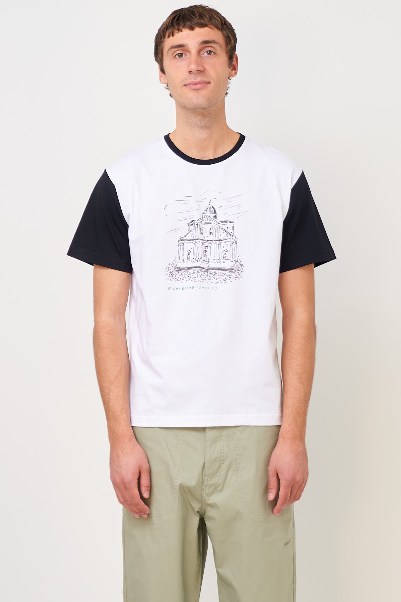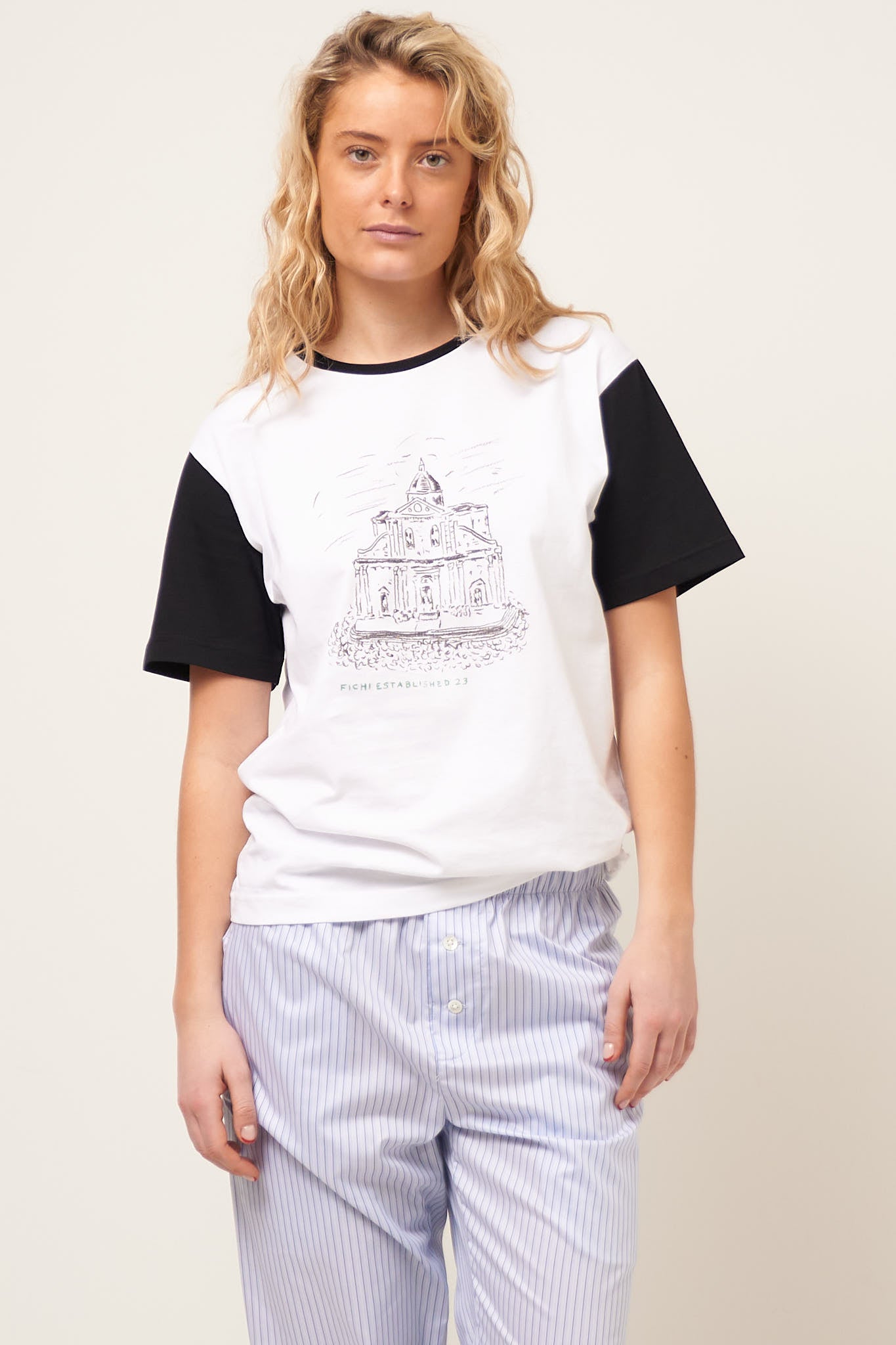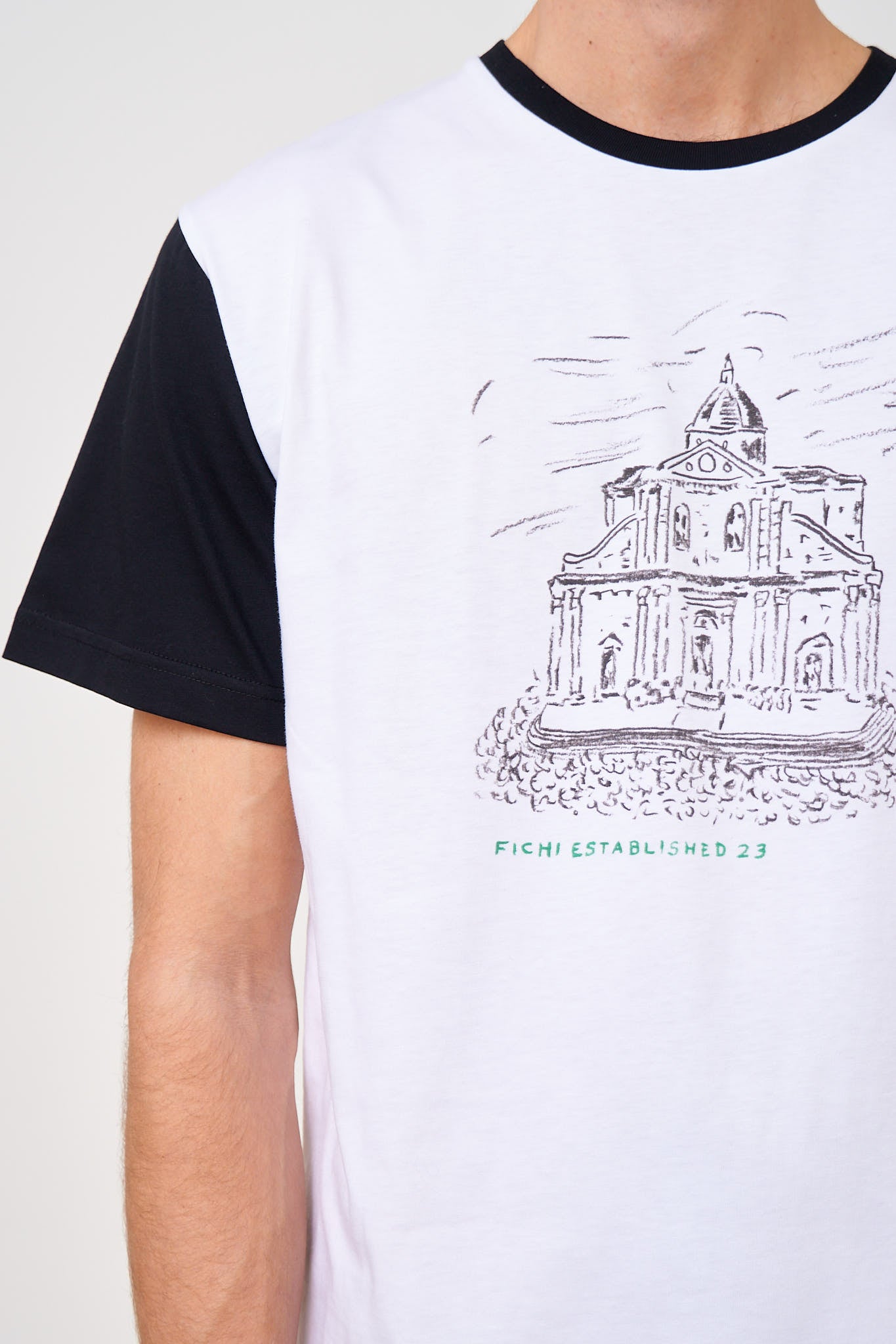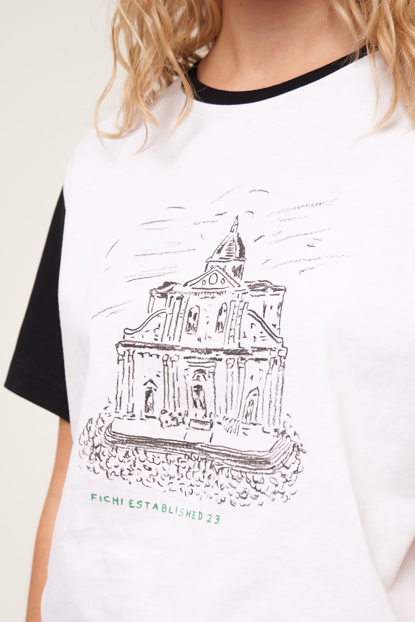 Old Church T-Shirt from Fichi. This t-shirt is made of soft cotton. It is designed with short sleeves and a round neckline in a contrasting color. The t-shirt has a print on the front designed by Jonathan Bjørn Elley.
