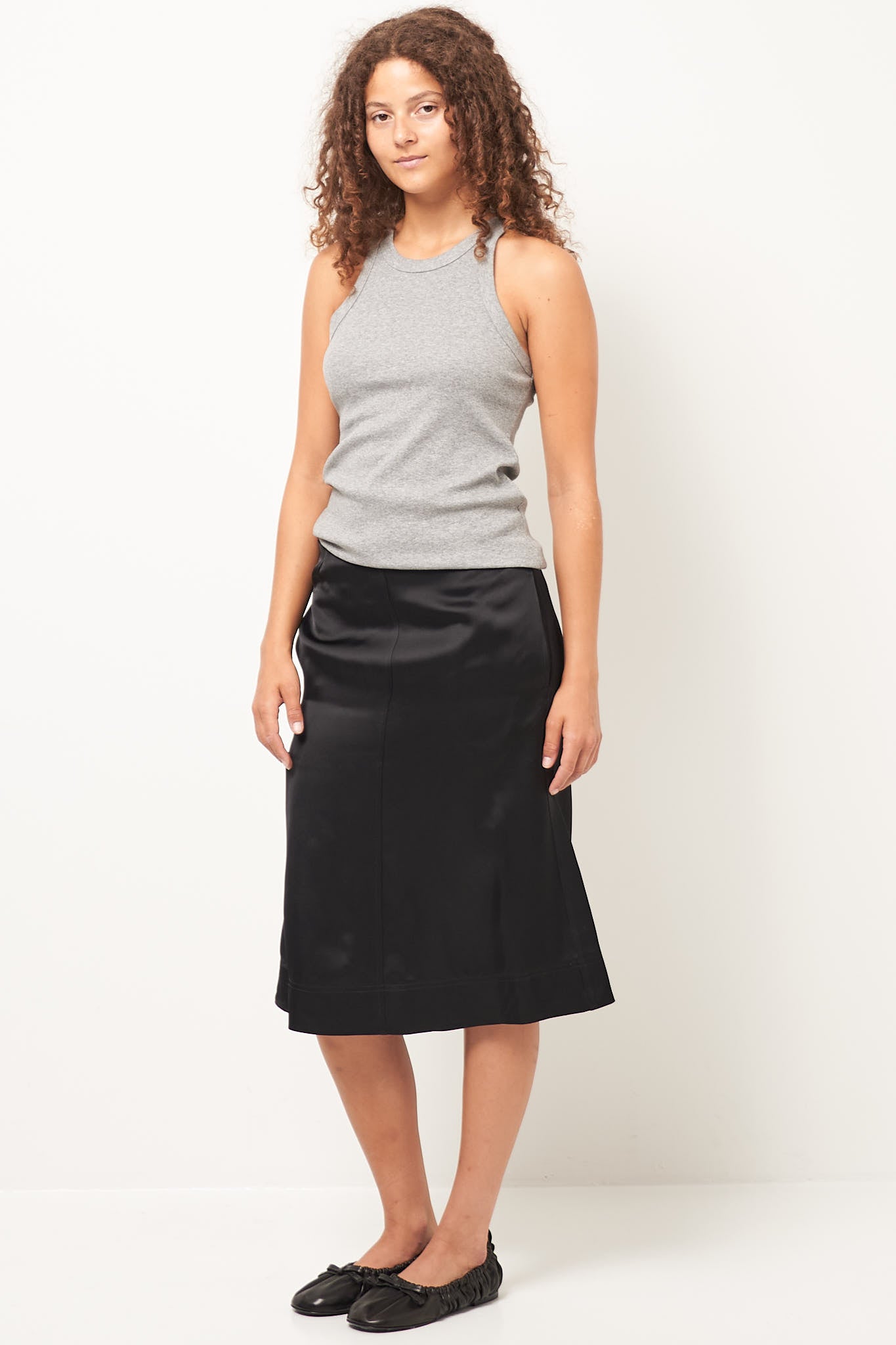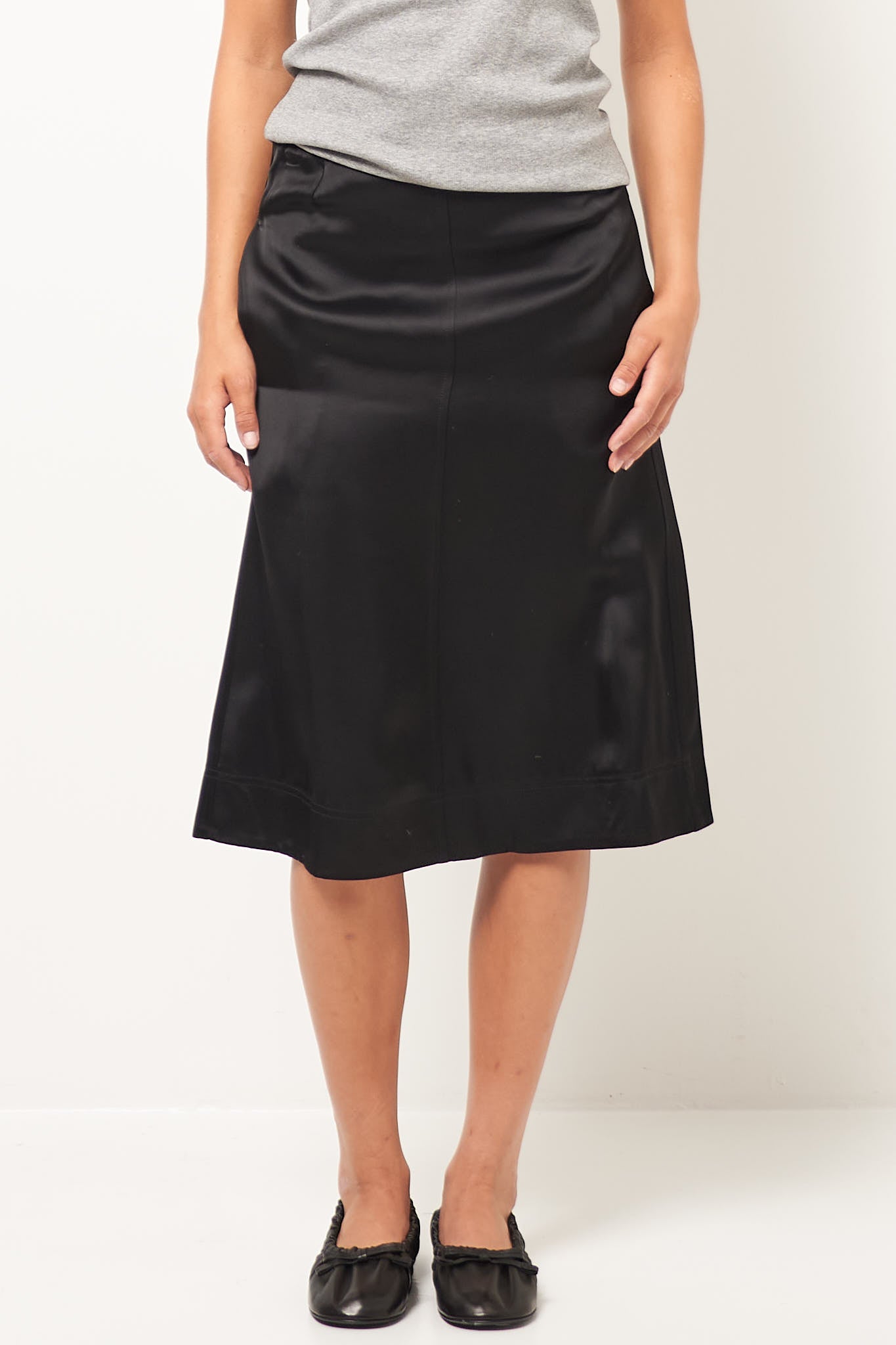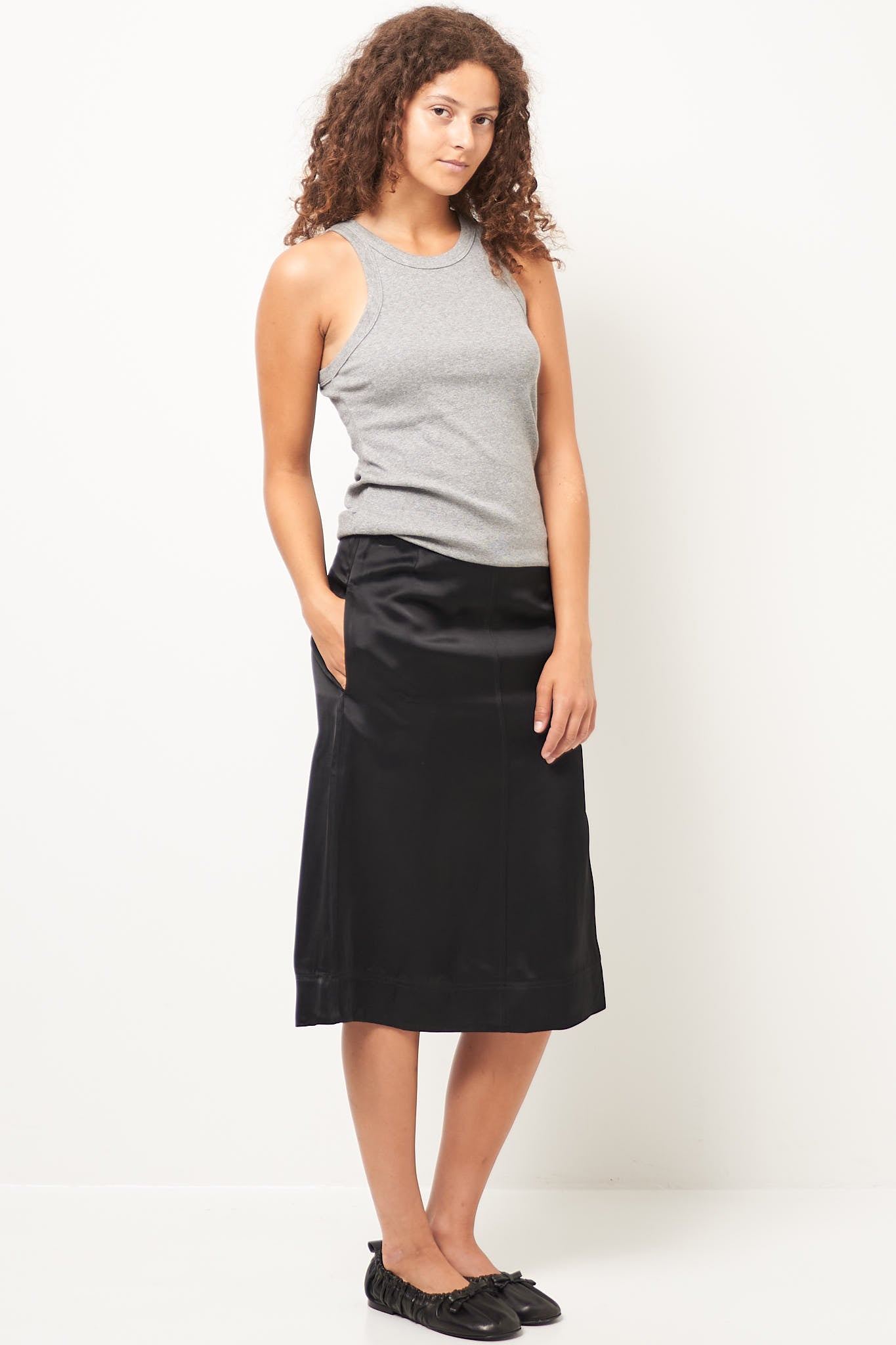 Paneled Satin Skirt Black from TOTEME. This skirt is made from a viscose with a satin look. It is designed in a fitted and straight silhouette with side pockets. The skirt closes with a hidden zipper.