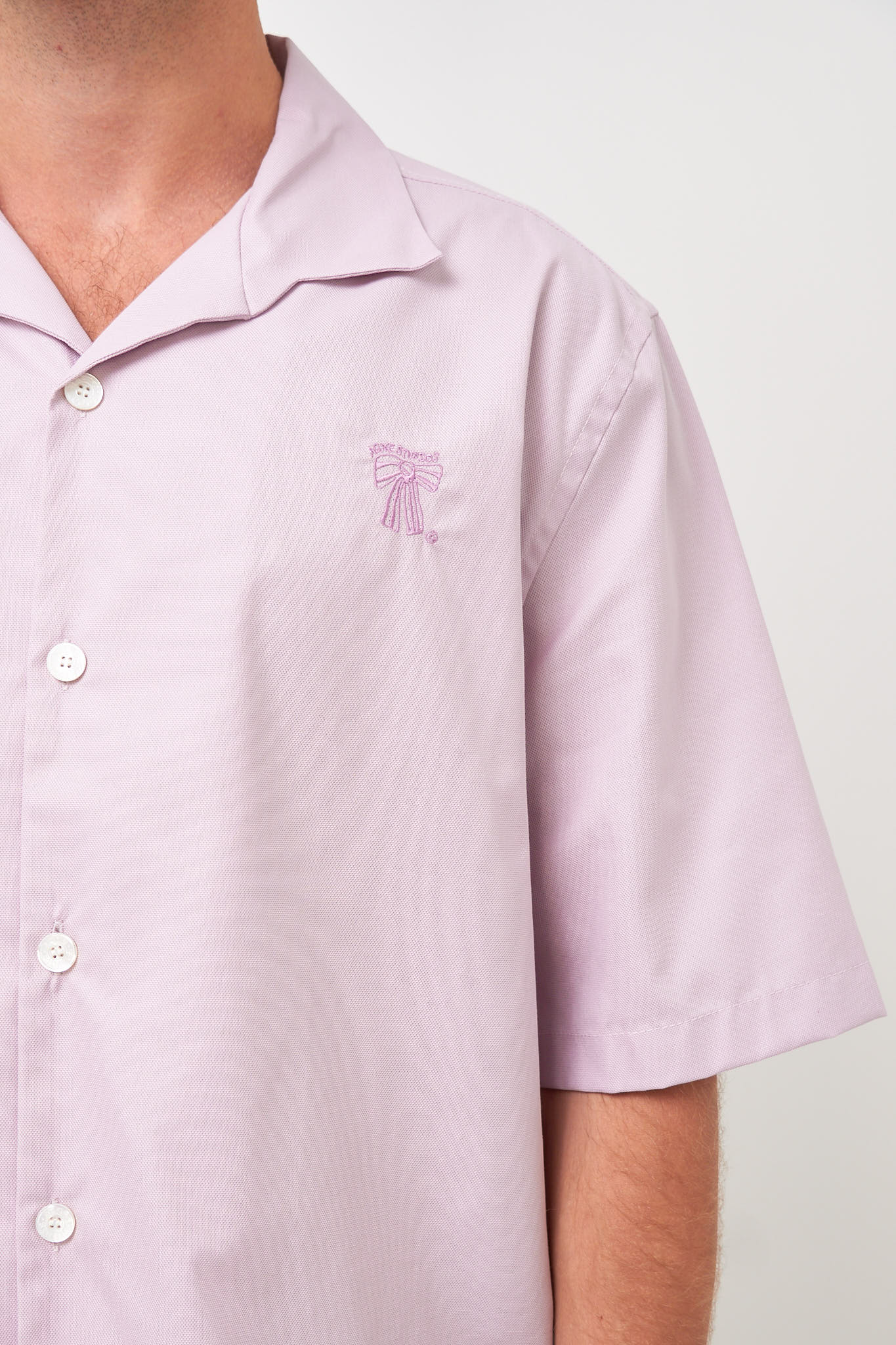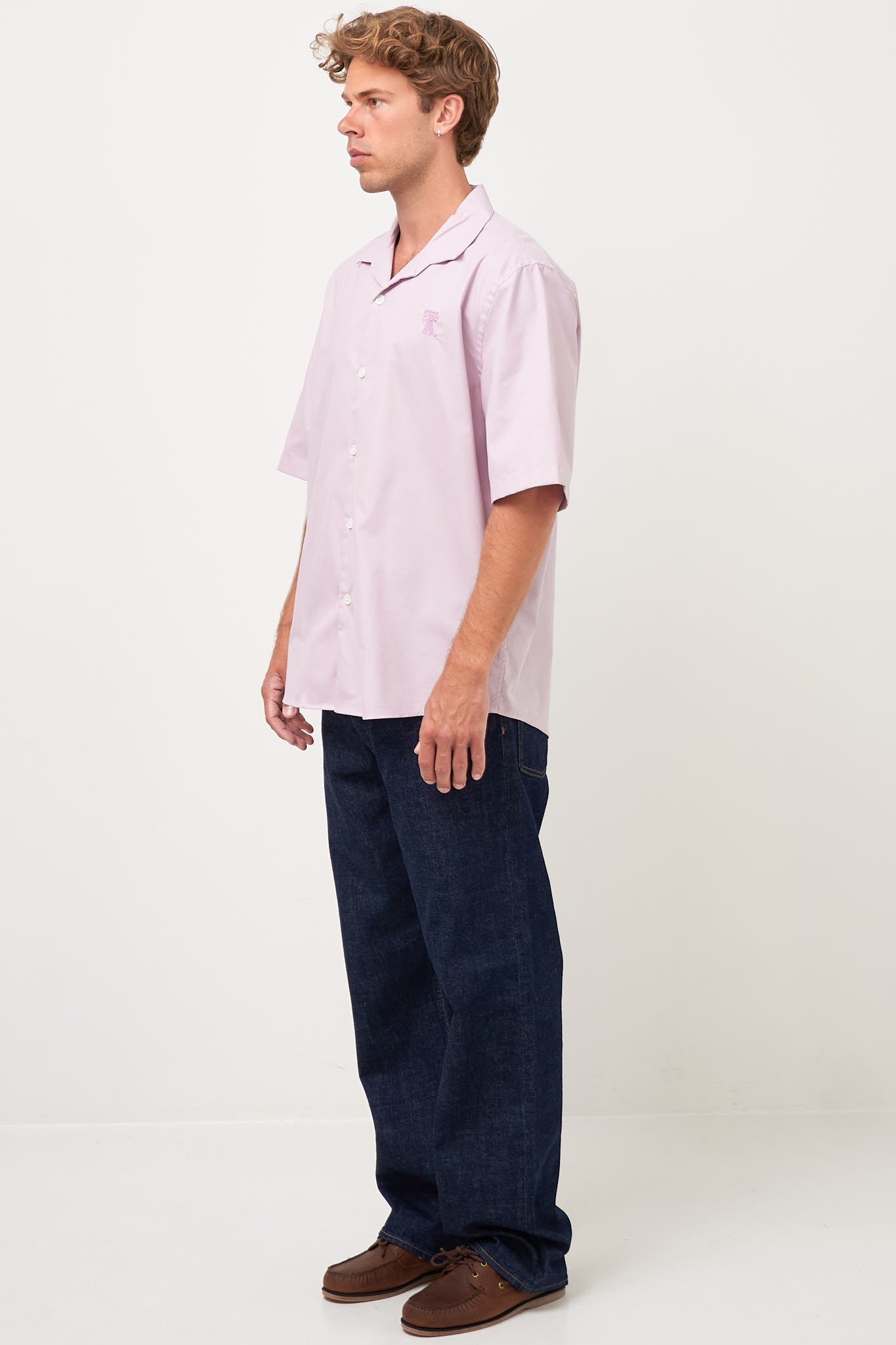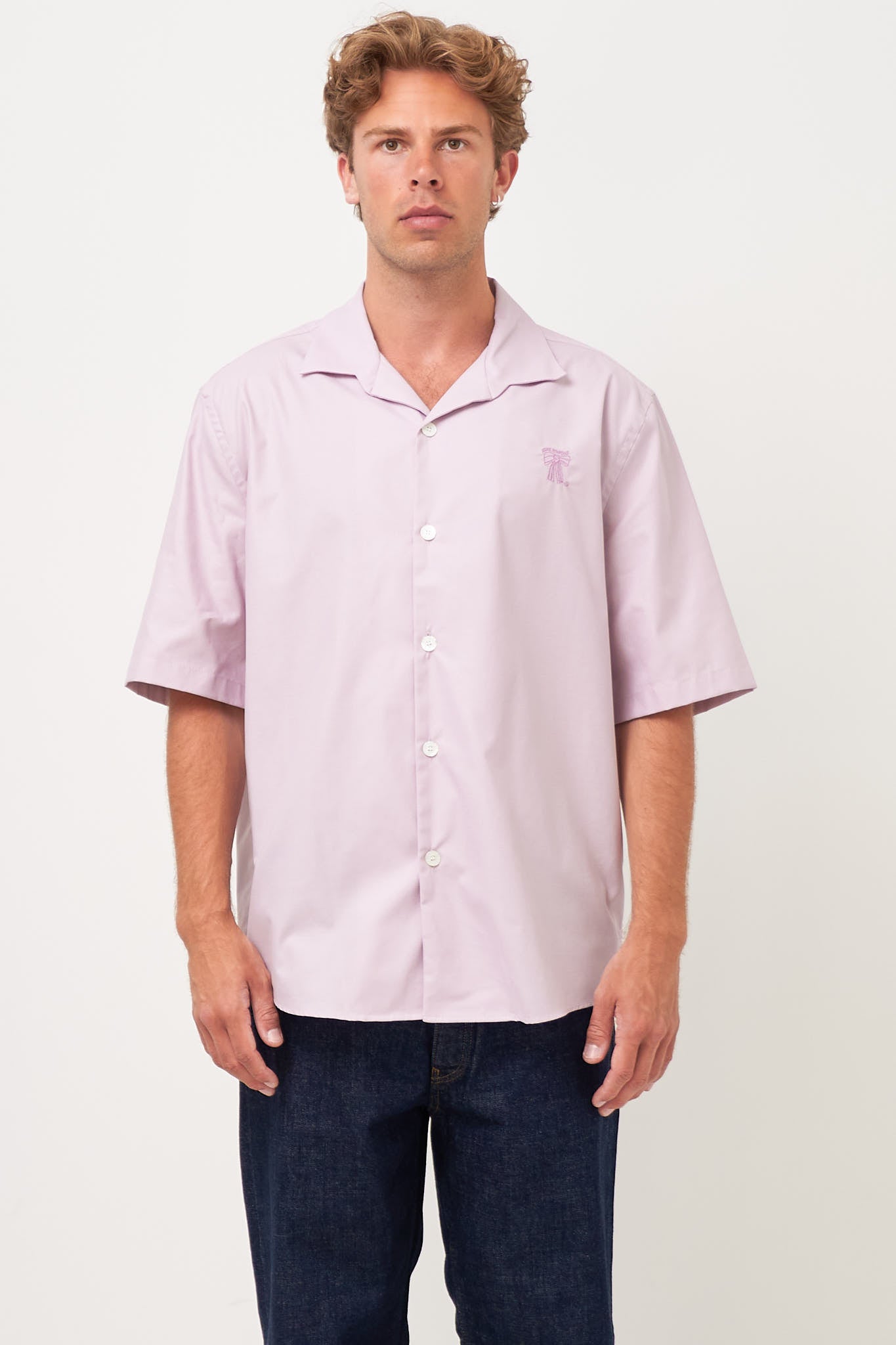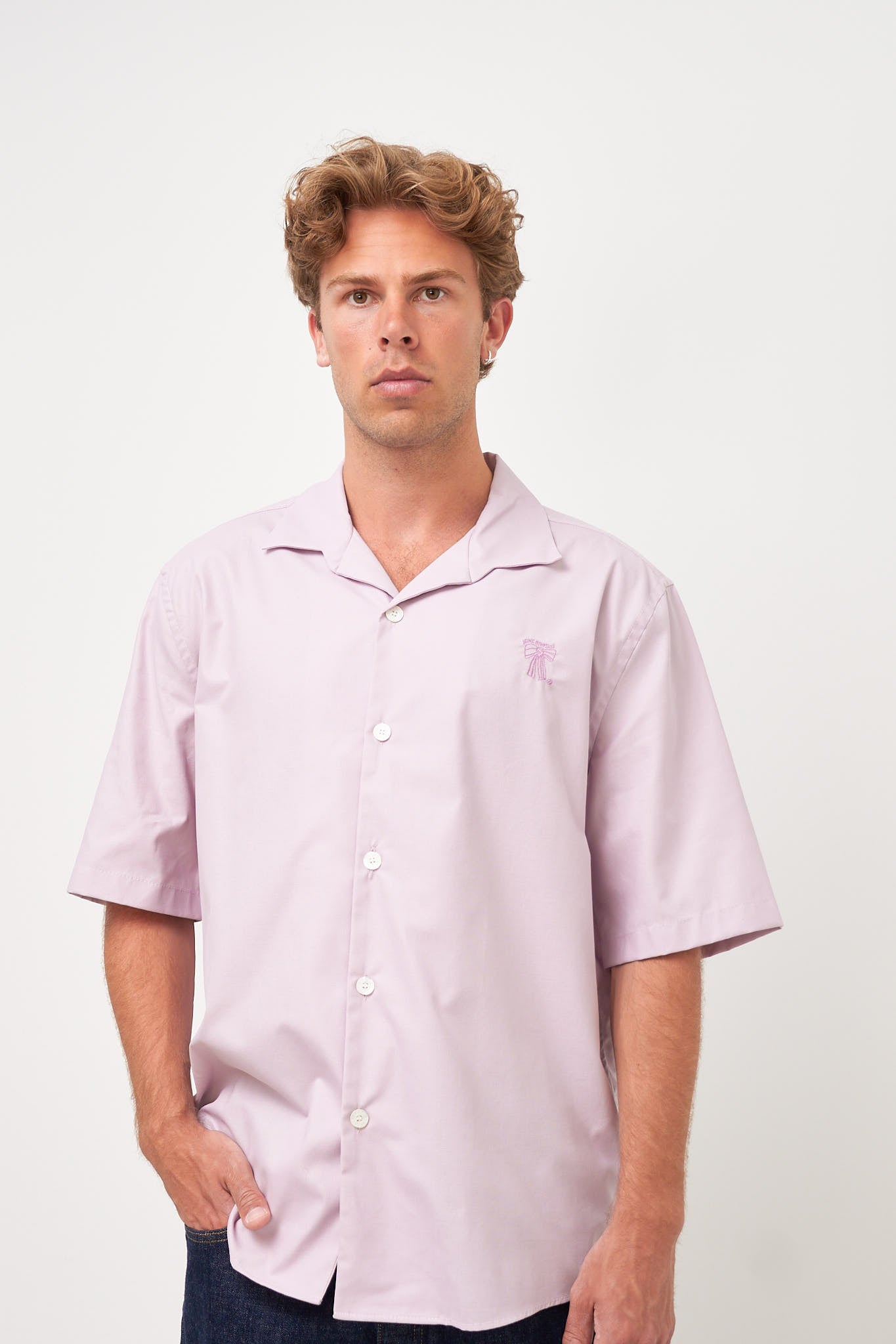 Short Sleeve Shirt Lilac from Acne Studios. This shirt is made from a textured cotton. It has an oversized fit with an Acne Studios logo on the chest. The shirt closes with buttons.