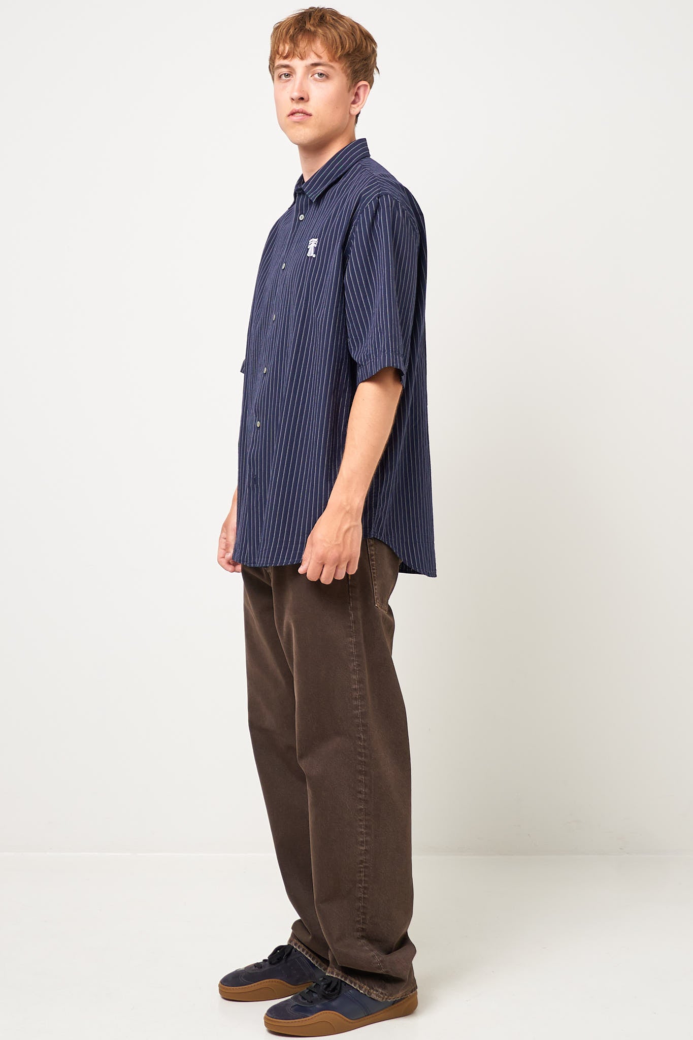 Short Sleeve Shirt Navy/White from Acne Studios. This shirt is made from a soft cotton. It has a regular fit with short sleeves and an Acne Studios logo on the chest.
