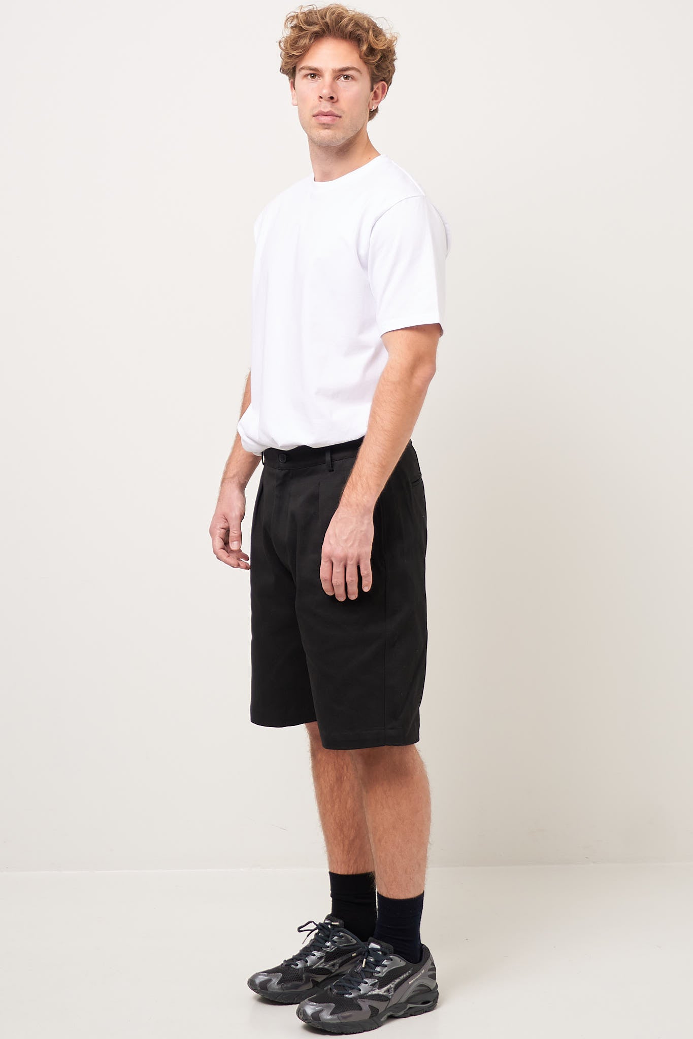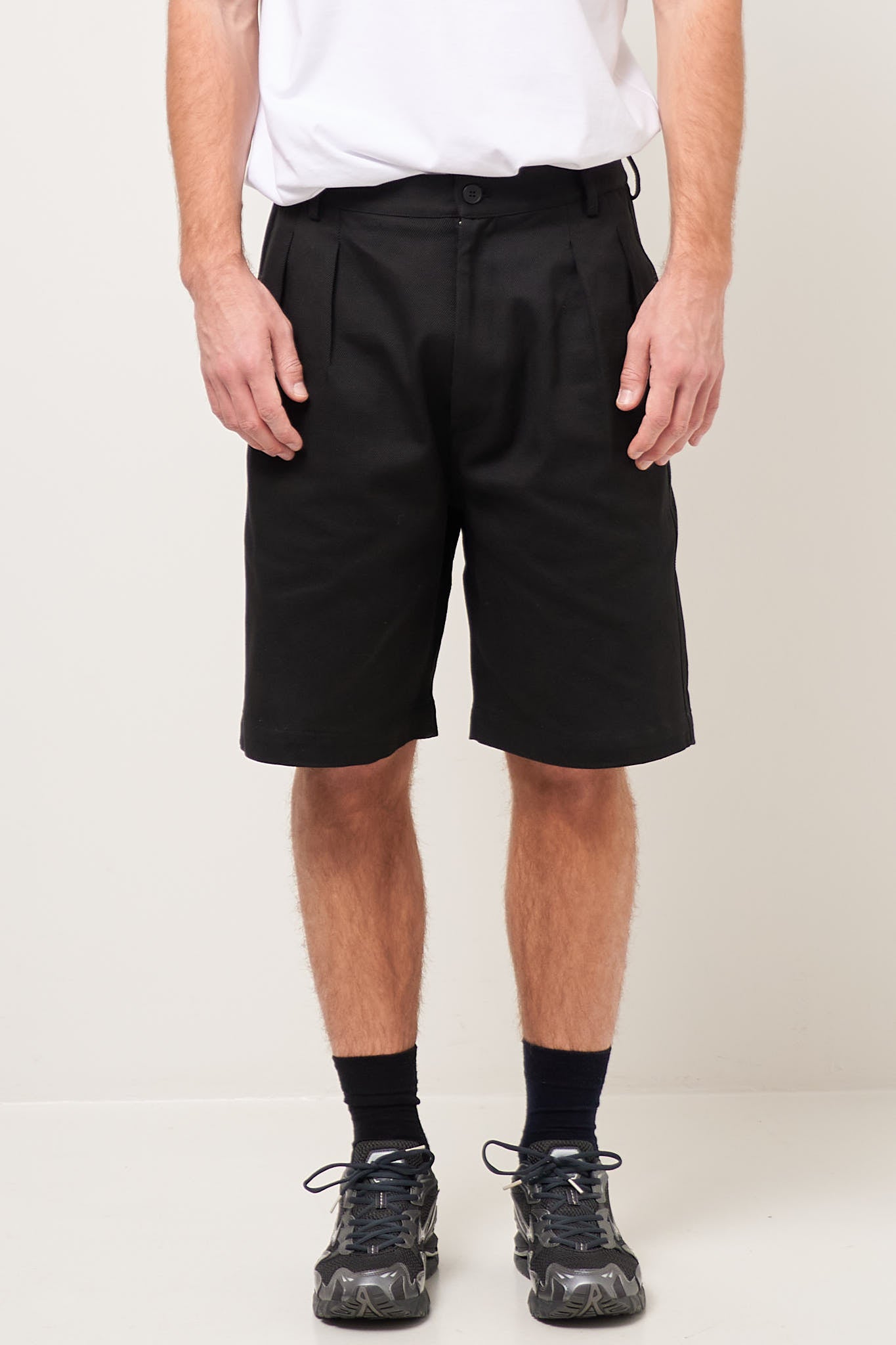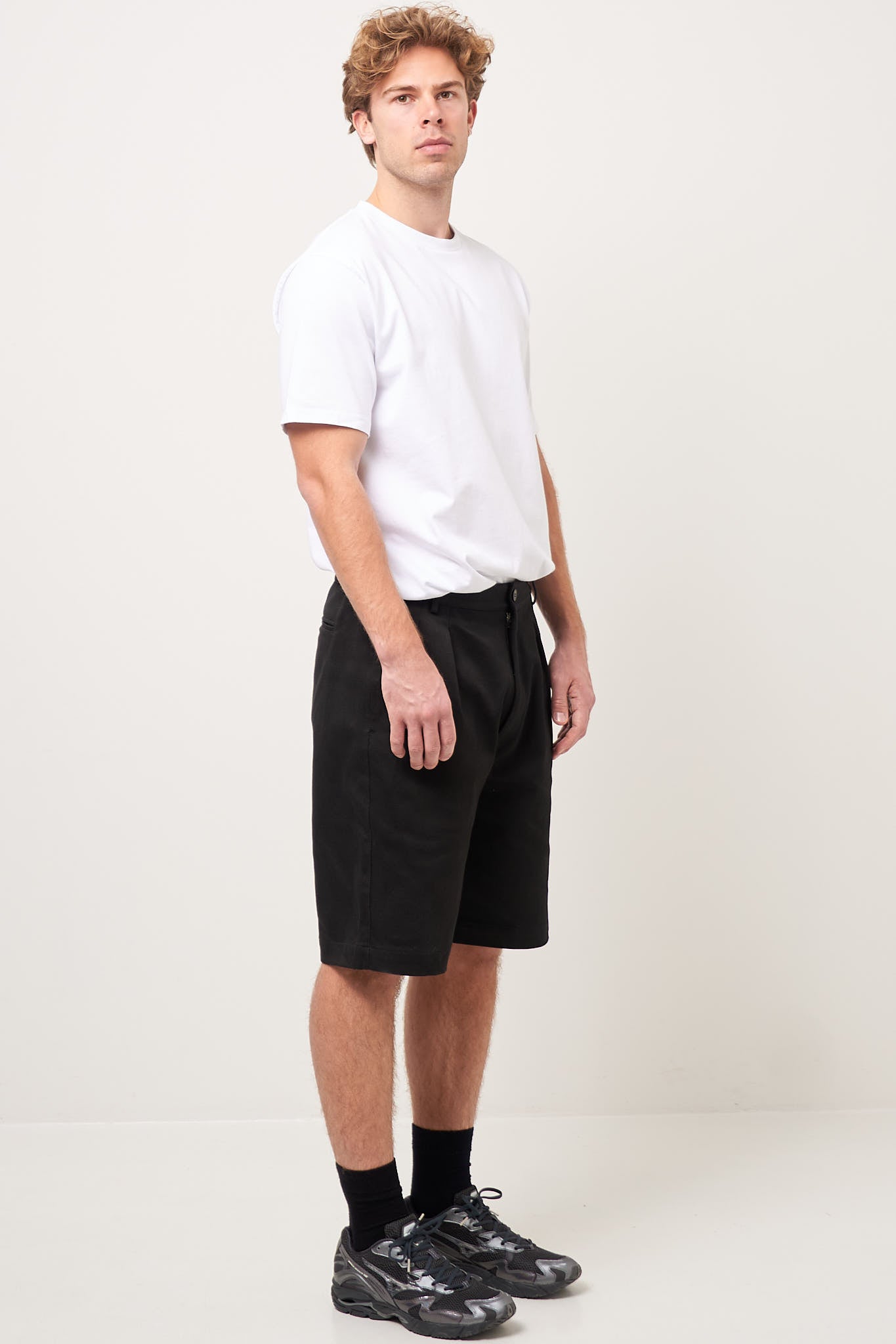 Fold Shorts Black Twill from STRØM. These shorts are made from a heavy textured cotton. They have a relaxed fit with pleats at the front and slanted side pockets and two back pockets. These shorts close with a button and zipper.