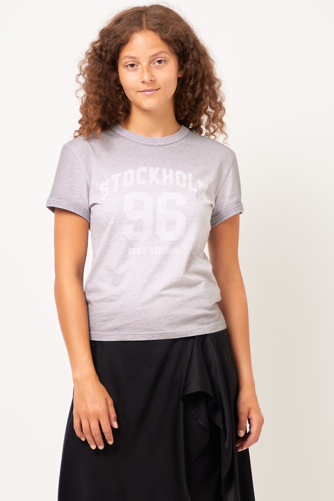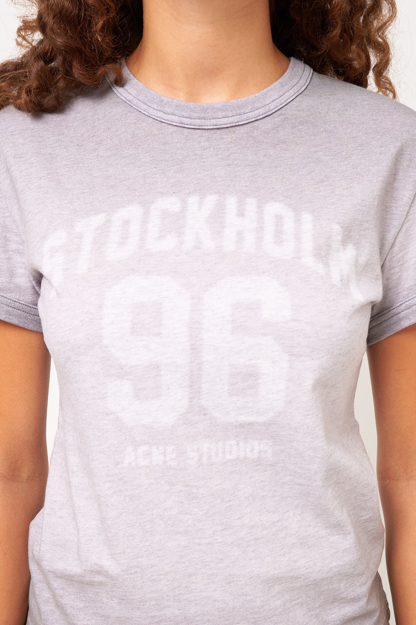 Sprayed Vintage Logo T-Shirt Grey Melange from Acne Studios. This t-shirt is made from soft cotton. It has a short and tight fit with short sleeves and a round neckline. The t-shirt has an Acne Studios logo on the front.
