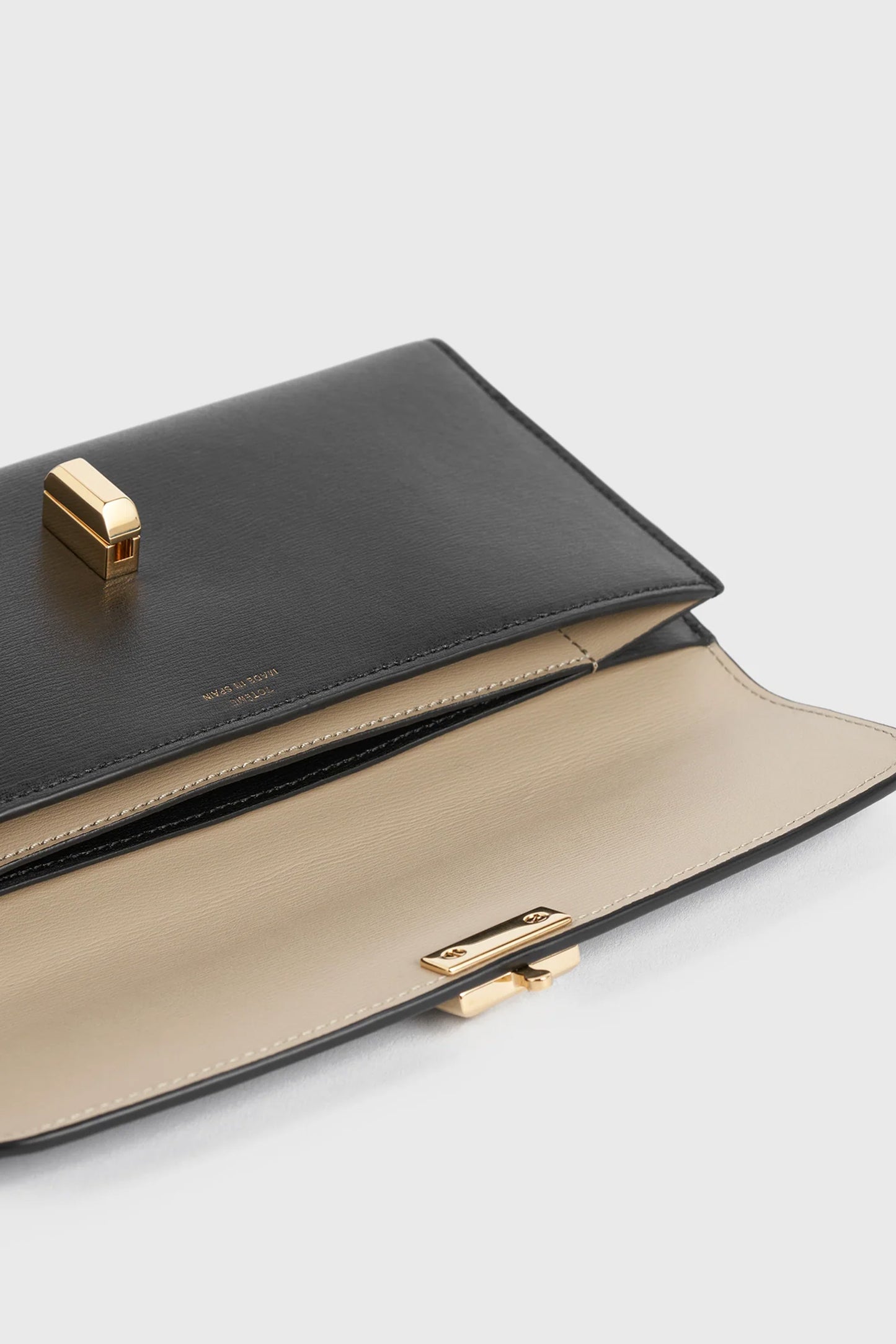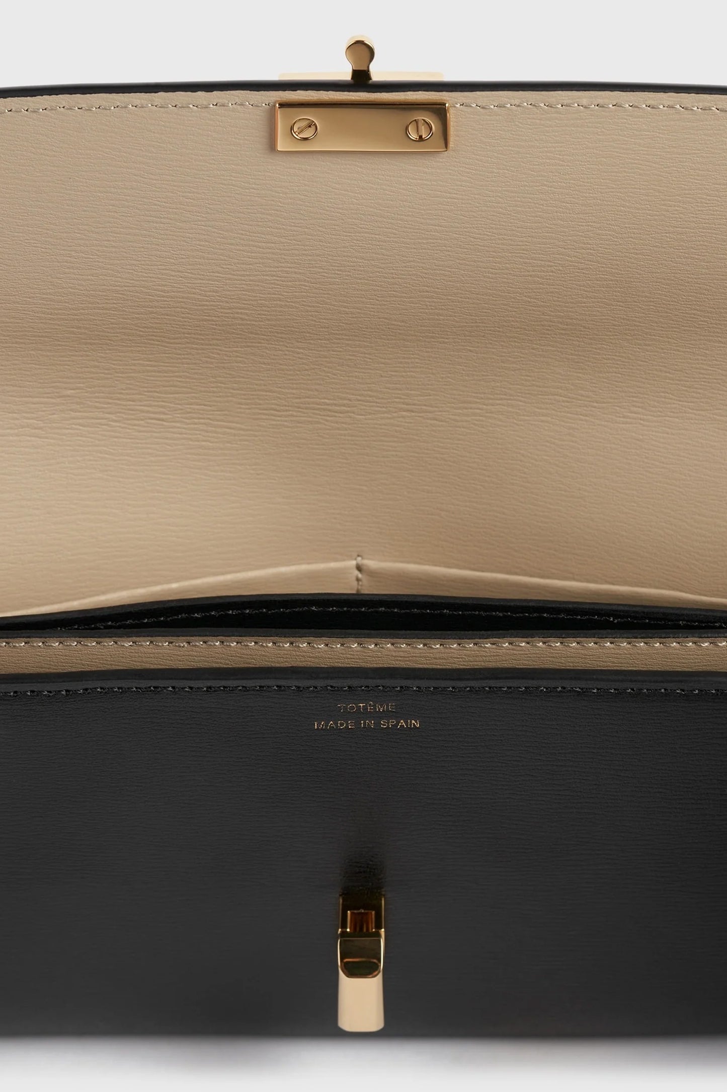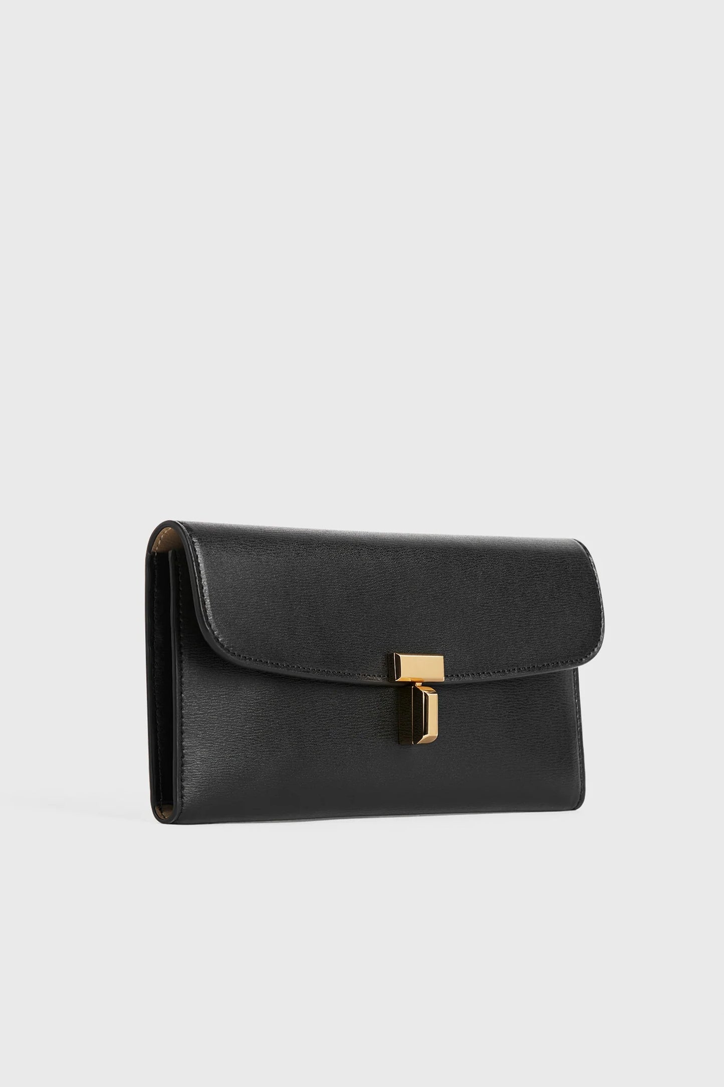 T-Lock Leather Wallet Black from TOTEME. this wallet is made of soft textured Palmellata leather. The wallet is designed with a lock that forms a T. It contains two larger compartments with pads for cards.