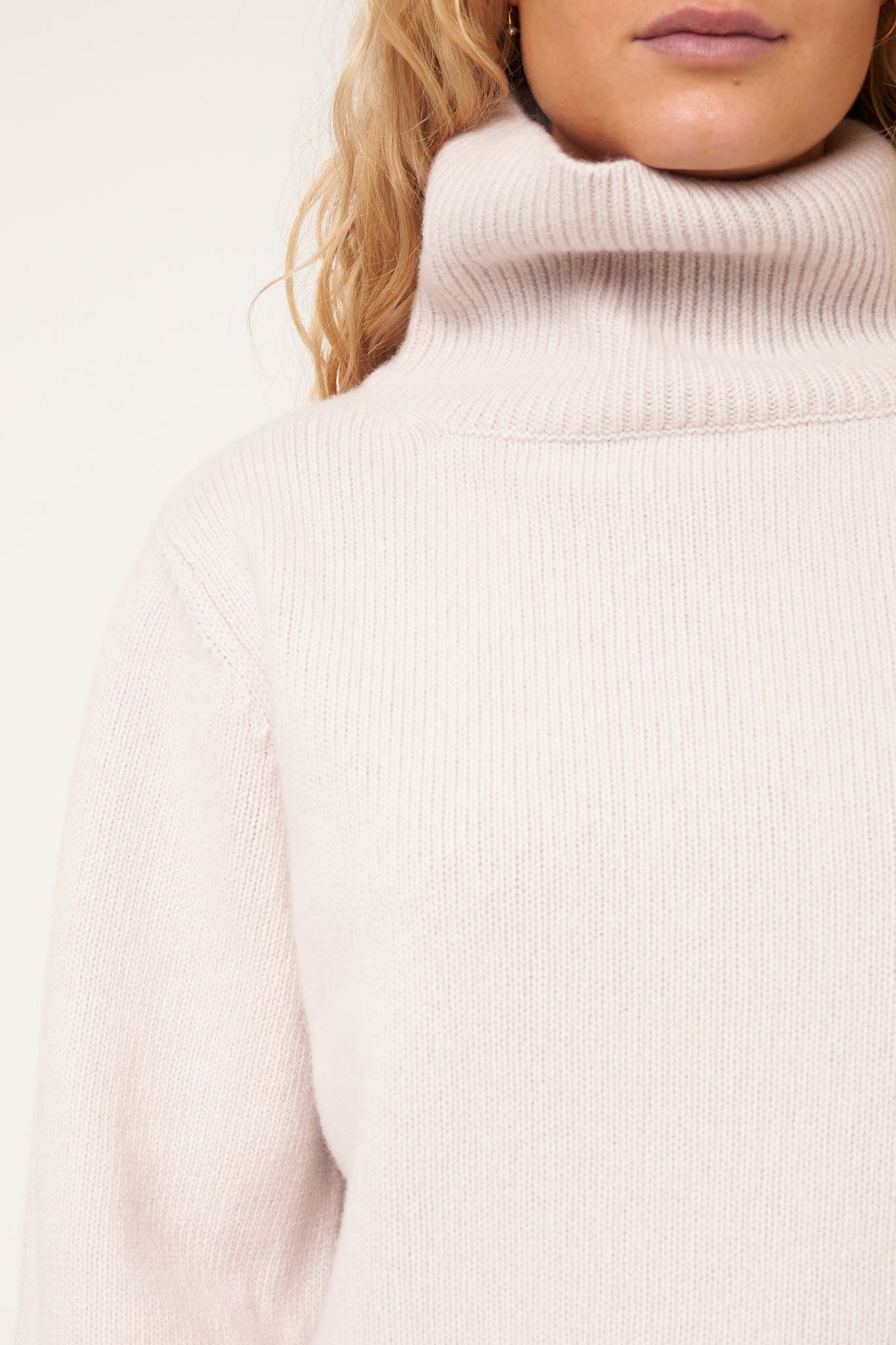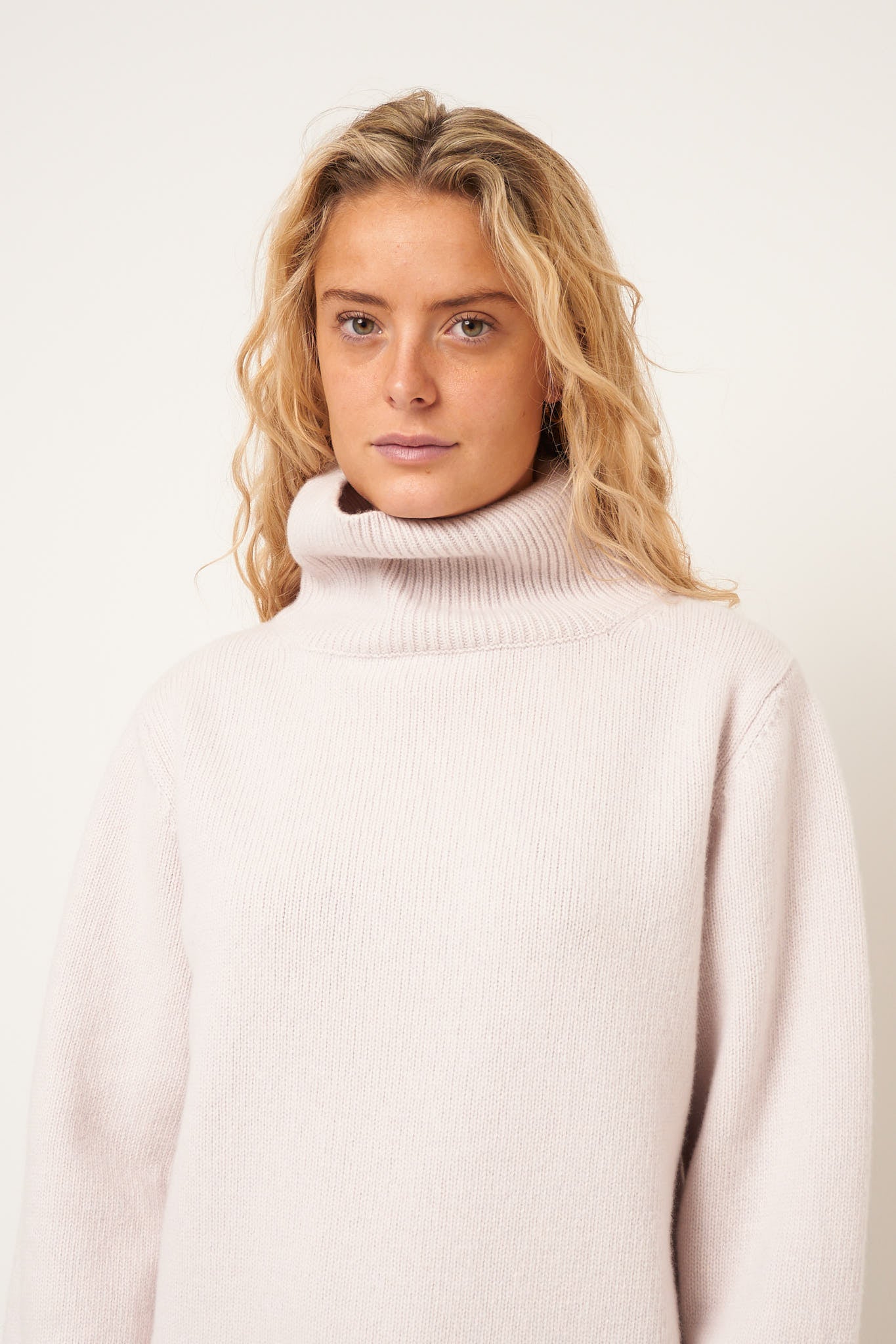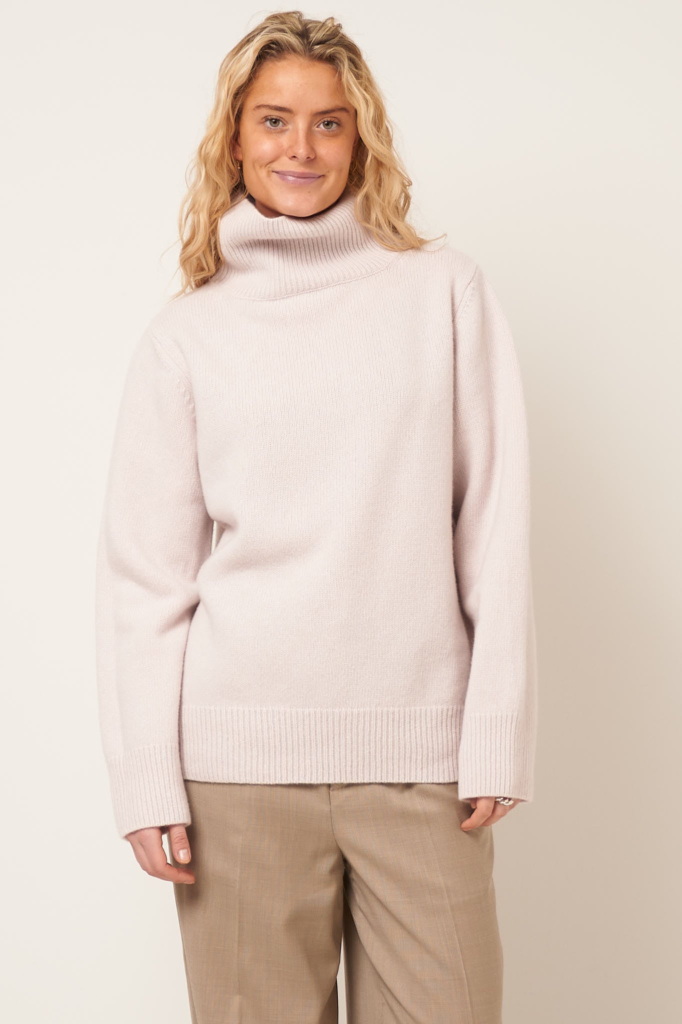 Visse Roll Neck Sweater Chalk from STRØM. This knit sweater is made in Italy and is made from 100% supersoft marino wool. It has an oversized fit with dropped shoulders and a high neck. The sweater is designed with wide ribbed edges at the neck, sleeves and hem.
