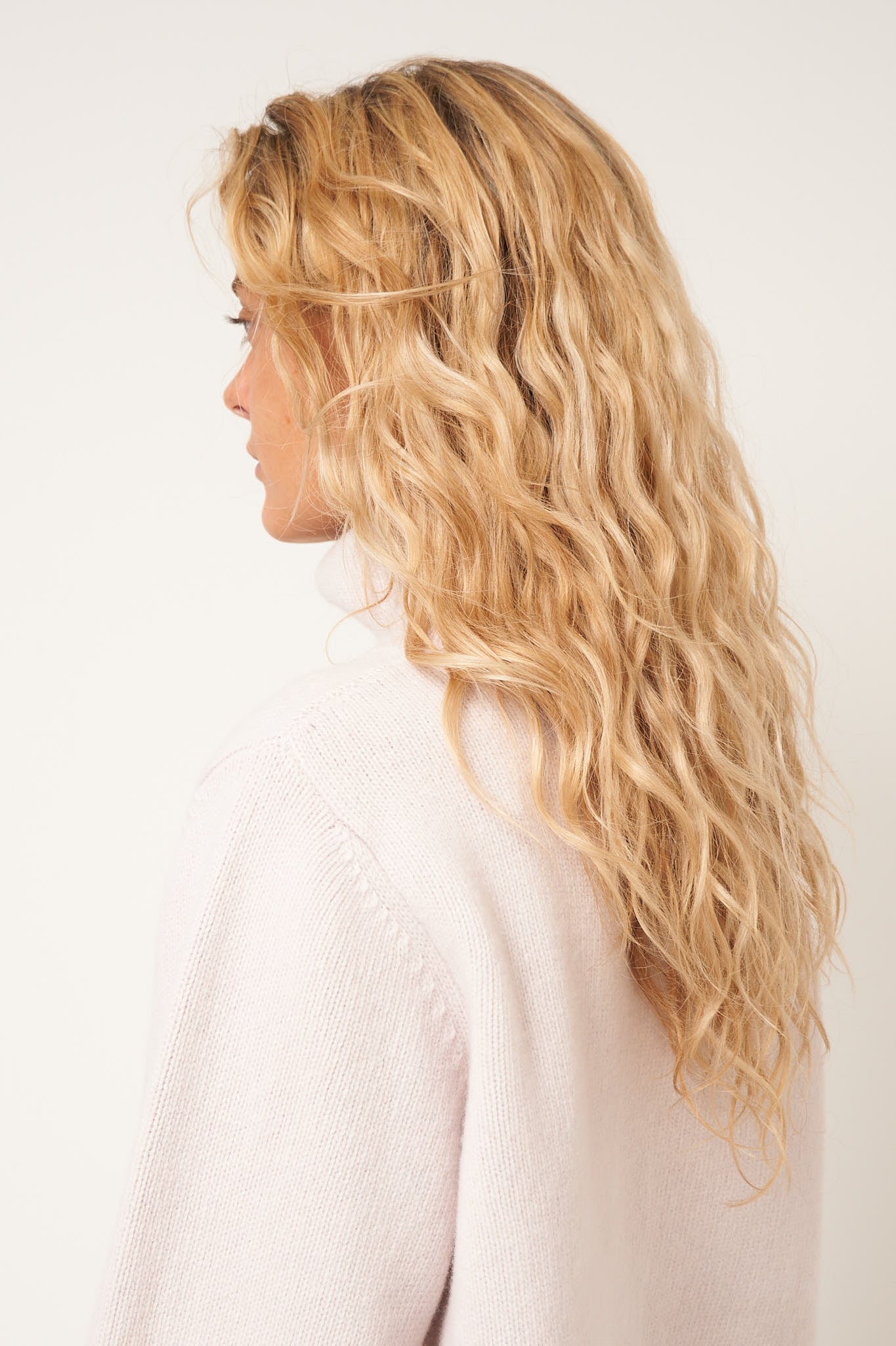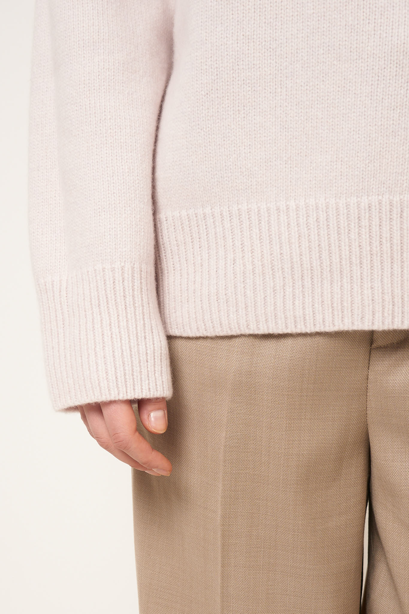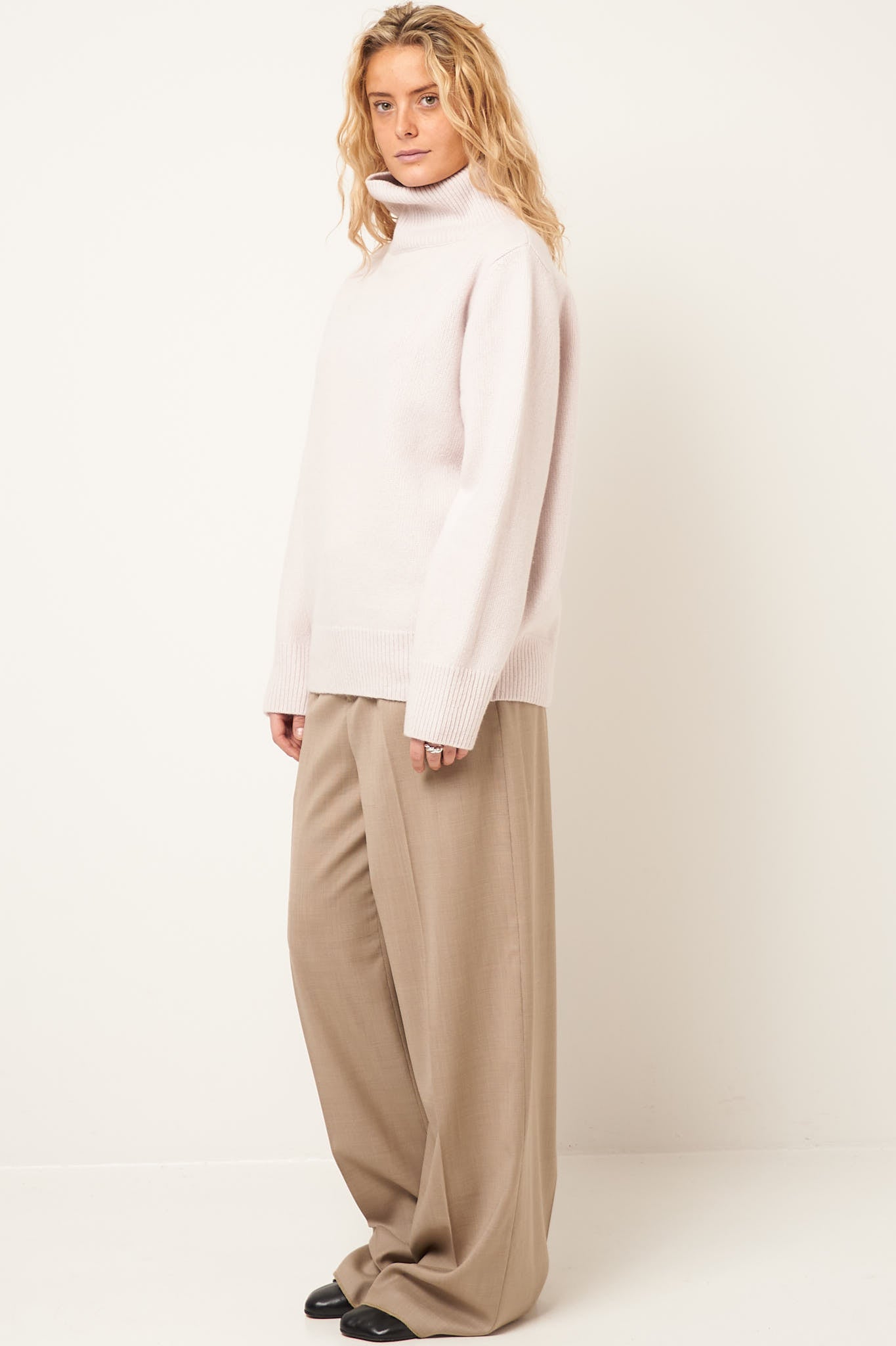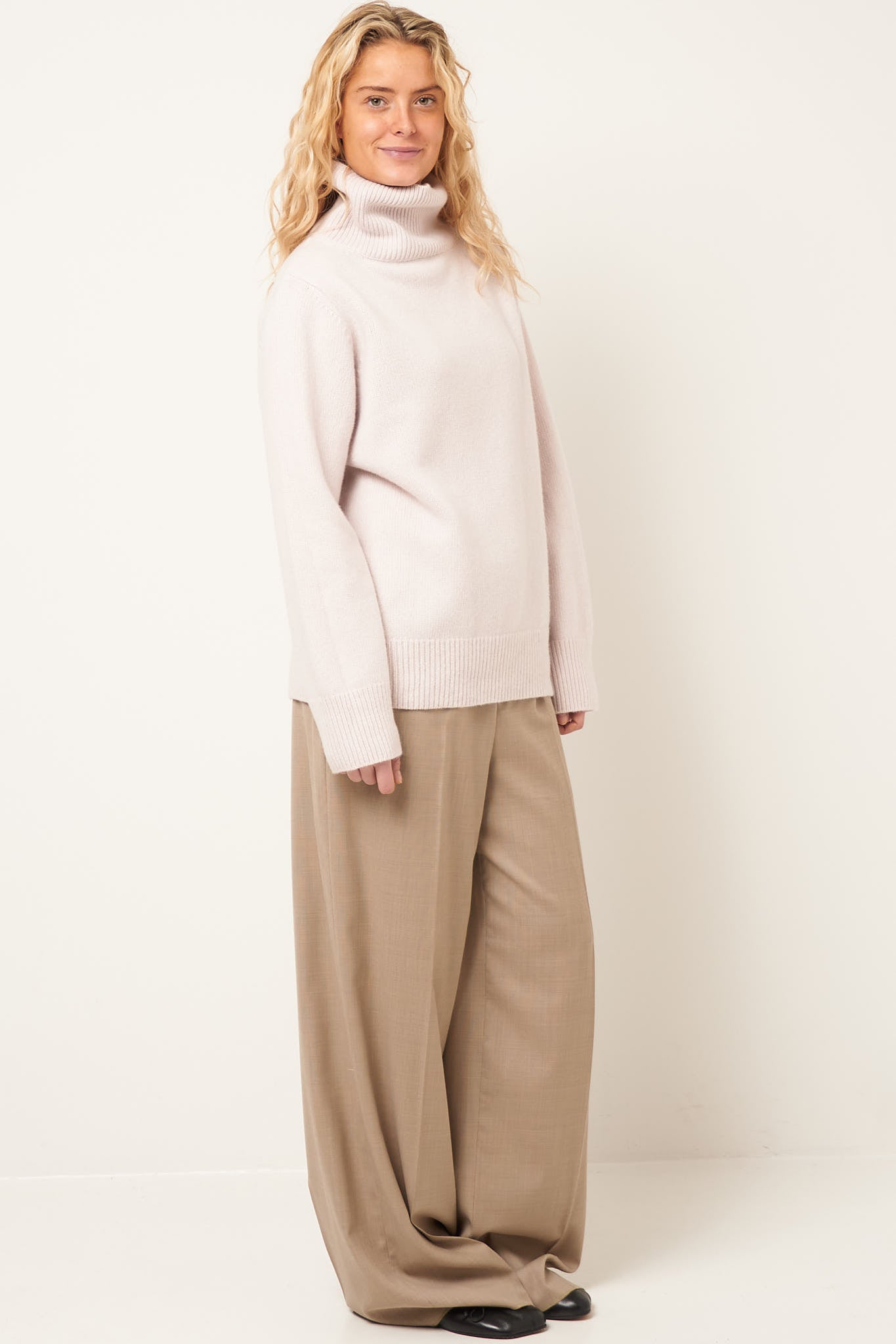 Visse Roll Neck Sweater Chalk from STRØM. This knit sweater is made in Italy and is made from 100% supersoft marino wool. It has an oversized fit with dropped shoulders and a high neck. The sweater is designed with wide ribbed edges at the neck, sleeves and hem.
