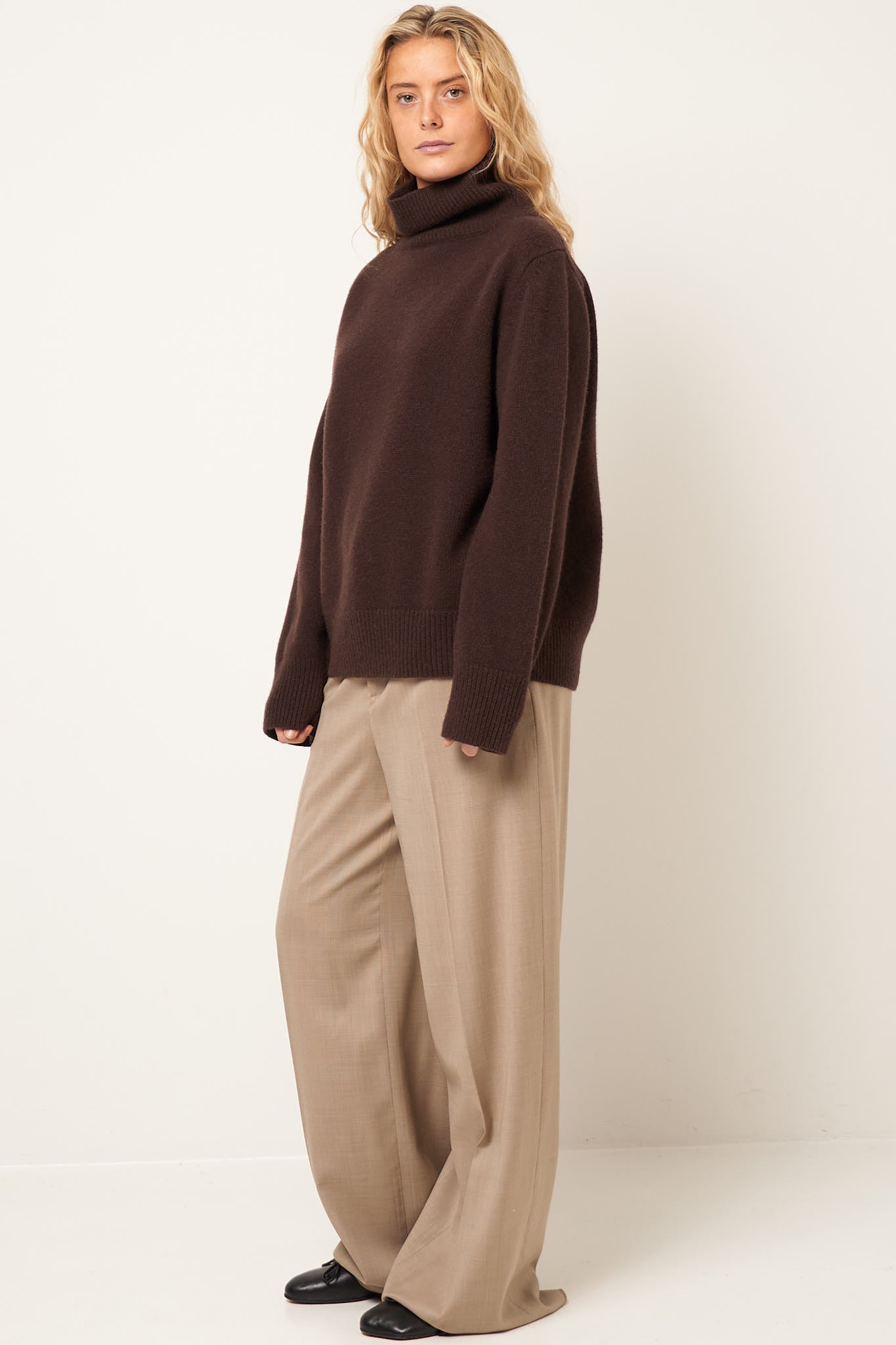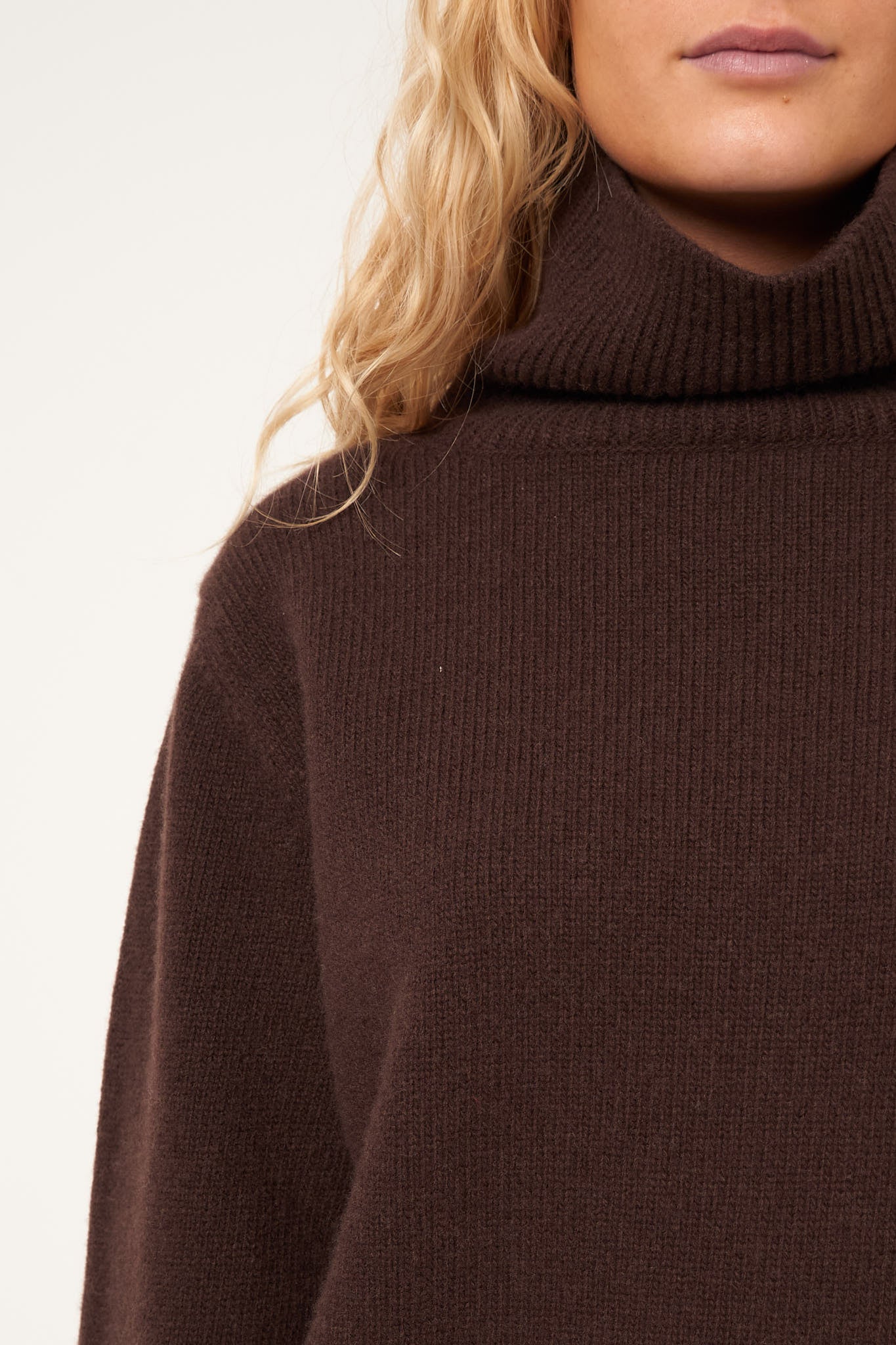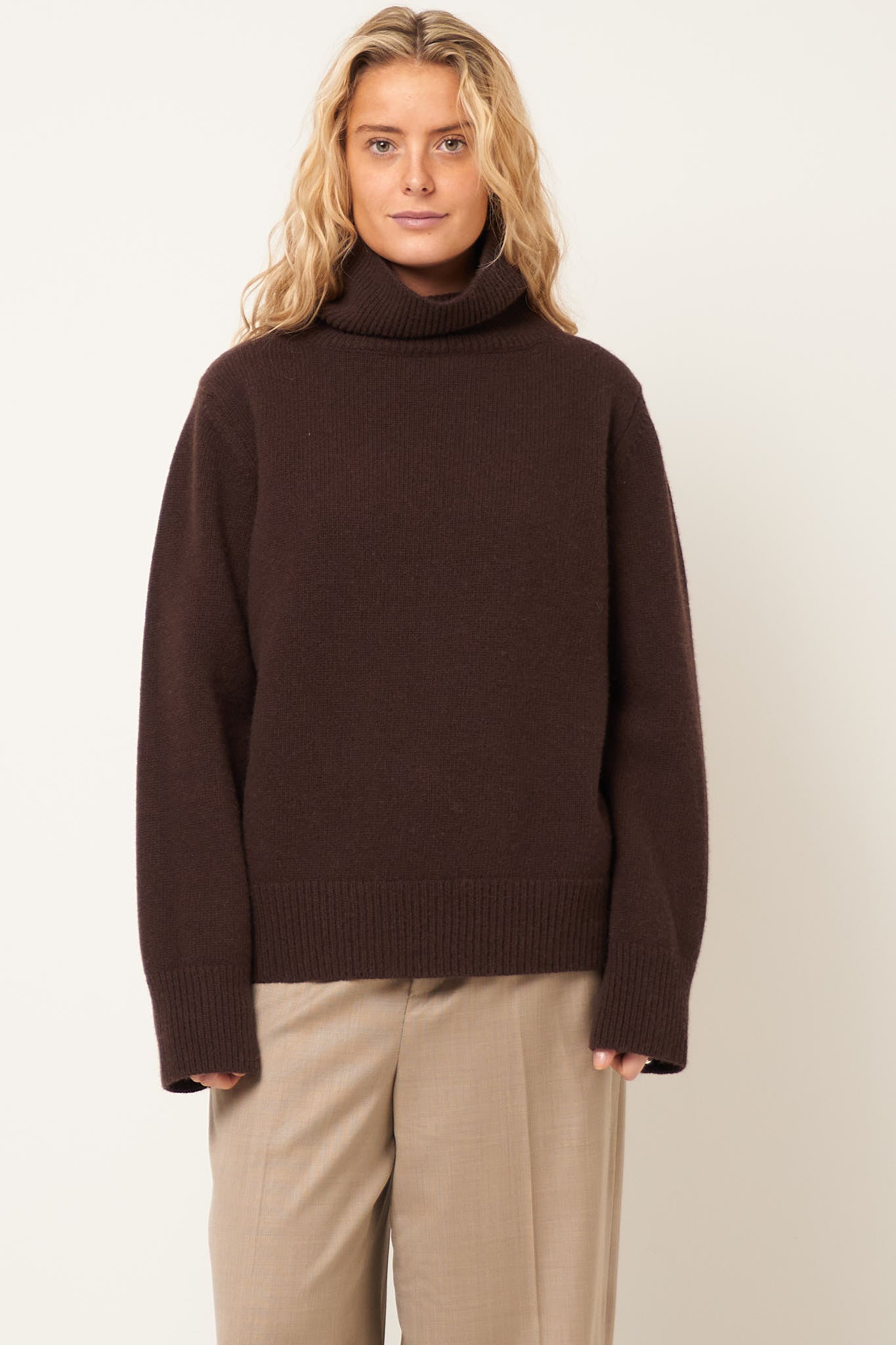 Visse Roll Neck Sweater Chocolate Brown from STRØM. This knitted sweater is produced in Italy and is made of 100% supersoft marino wool. It has an oversized fit with dropped shoulders and a high neck. The knit is designed with wide ribbed edges at the neck, sleeves and hem.