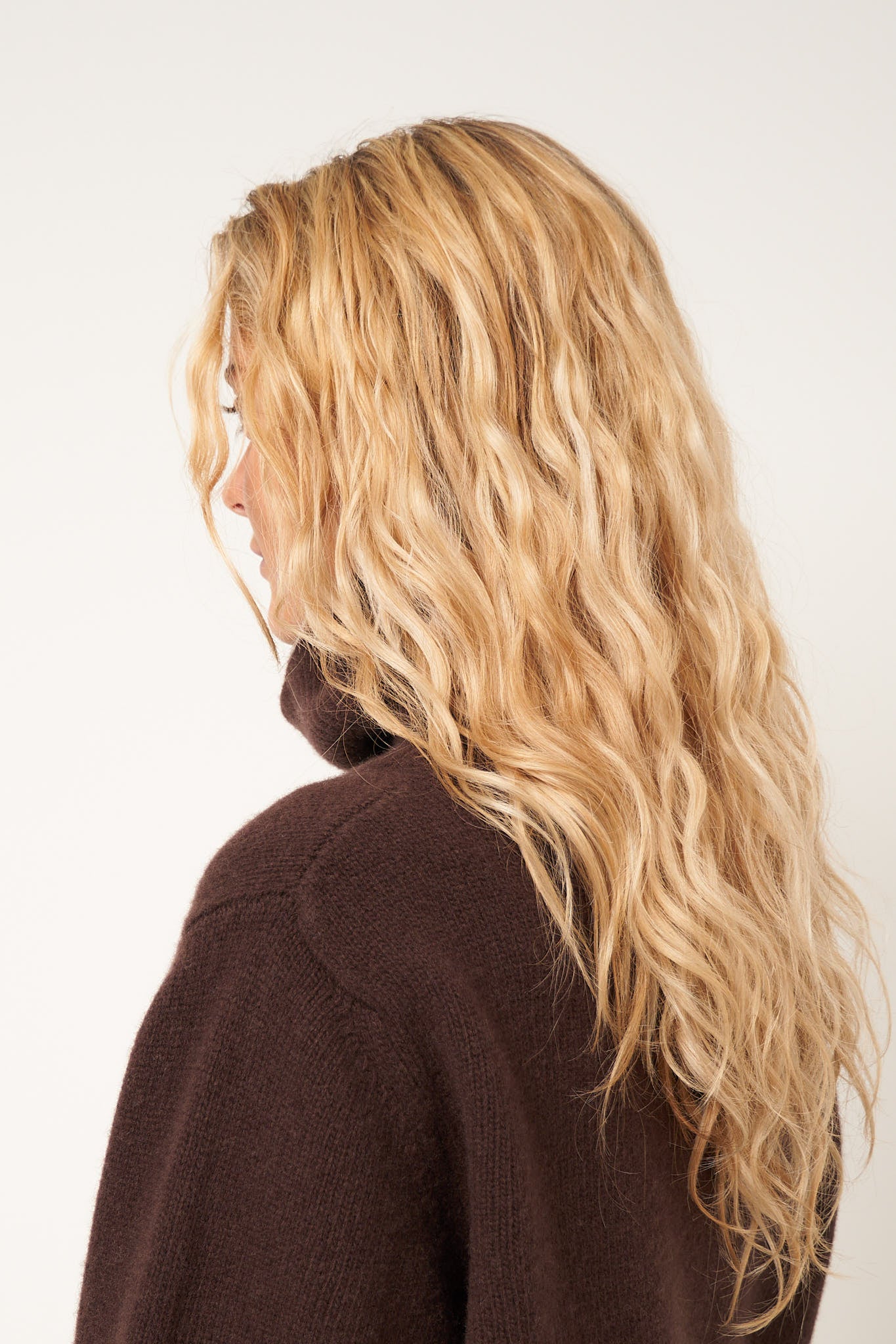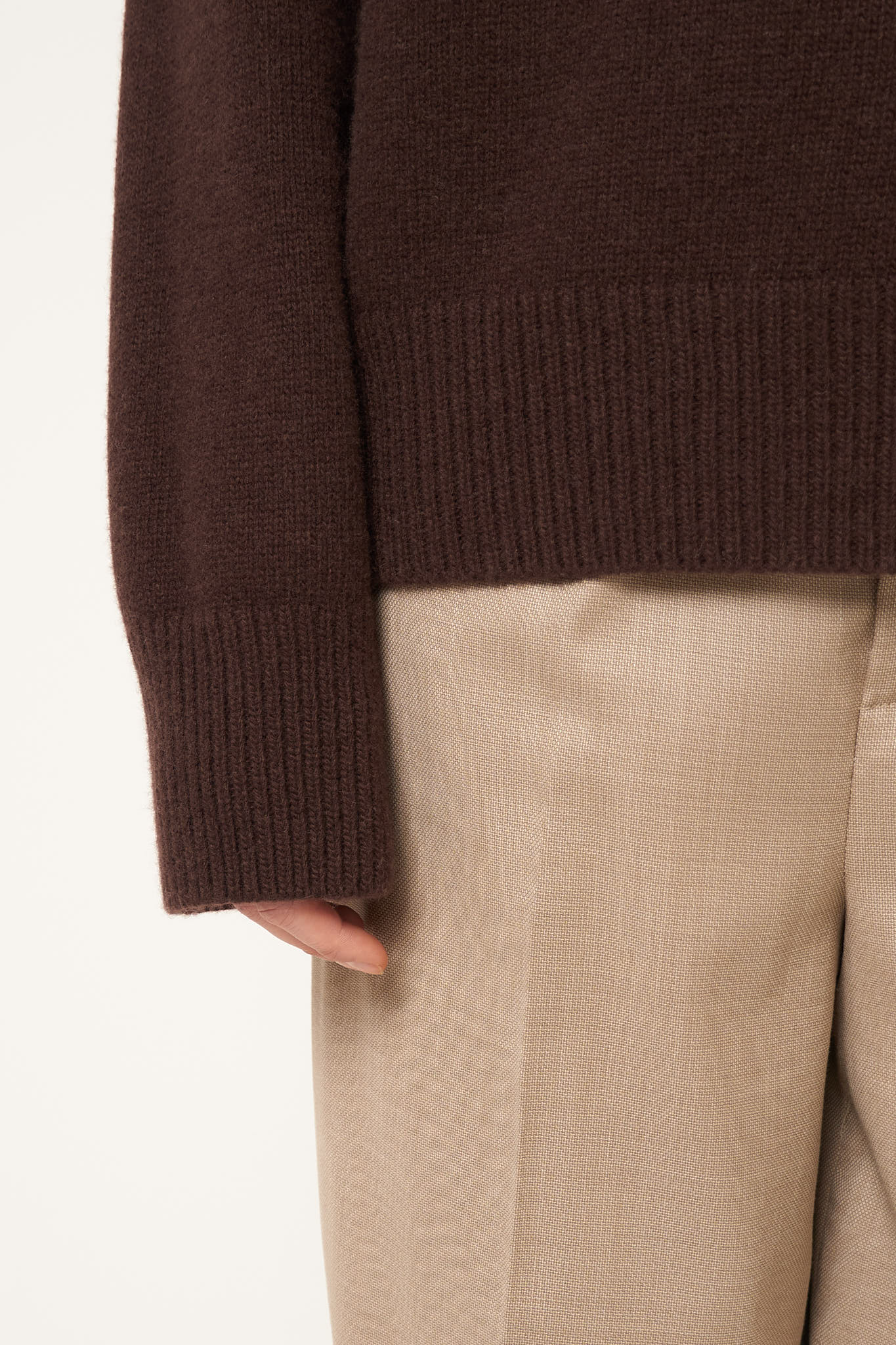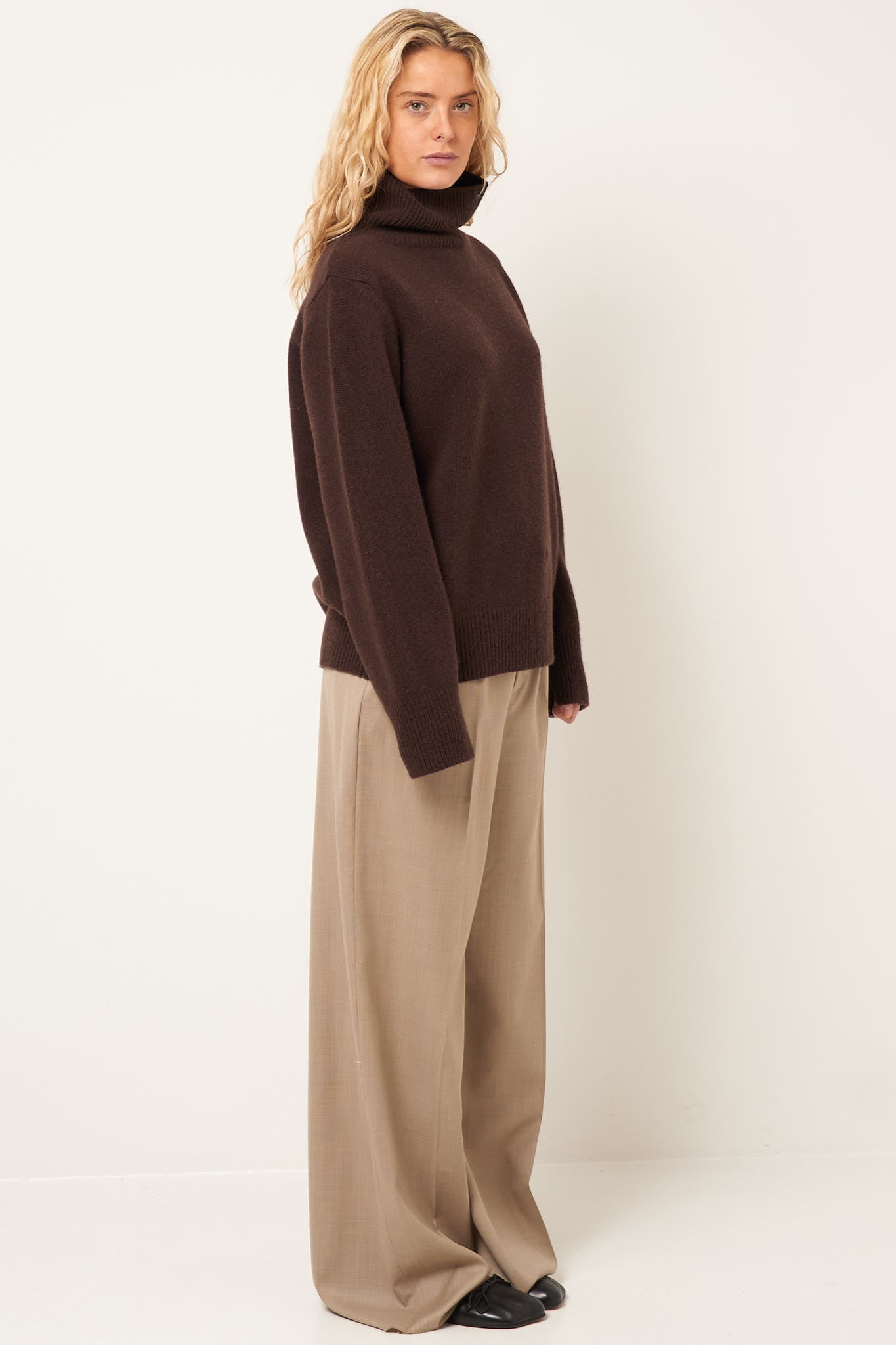 Visse Roll Neck Sweater Chocolate Brown from STRØM. This knitted sweater is produced in Italy and is made of 100% supersoft marino wool. It has an oversized fit with dropped shoulders and a high neck. The knit is designed with wide ribbed edges at the neck, sleeves and hem.