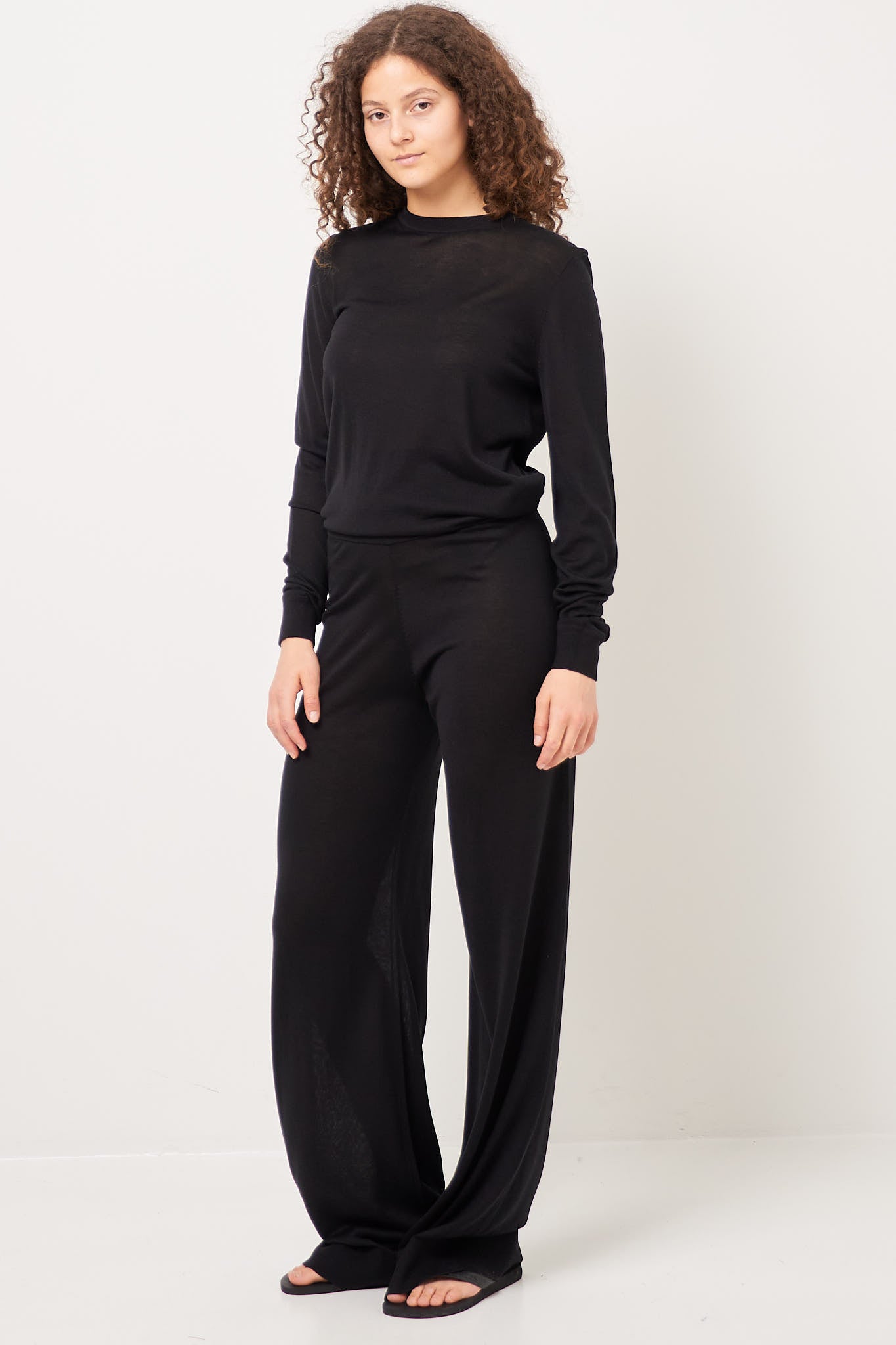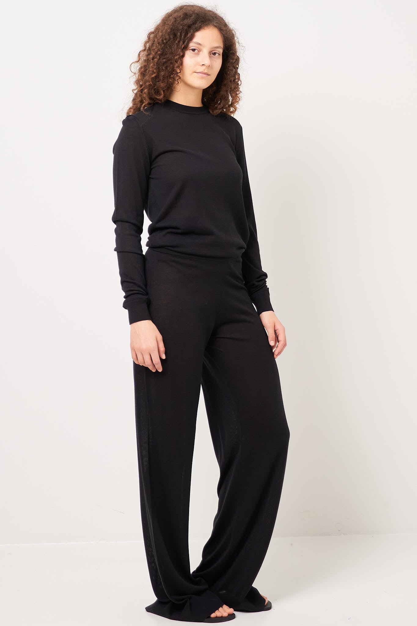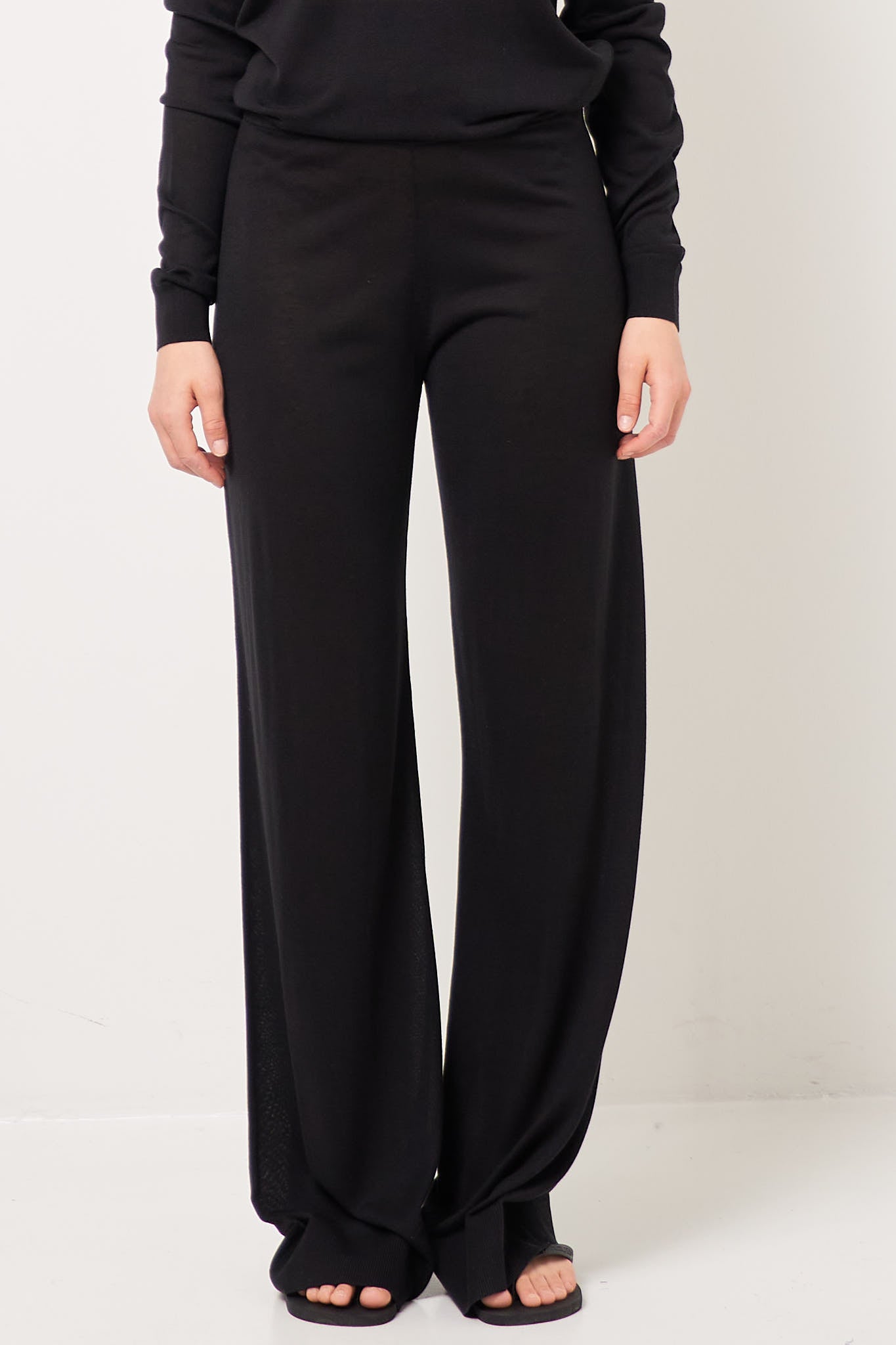 Wide Knit Trousers Black from TOTEME. These trousers are made from a fine and semi-sheer wool and silk blend. They have a relaxed fit with straight legs and an elasticated waist.