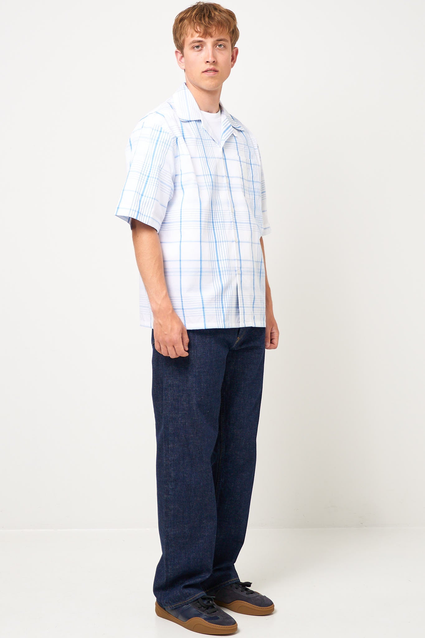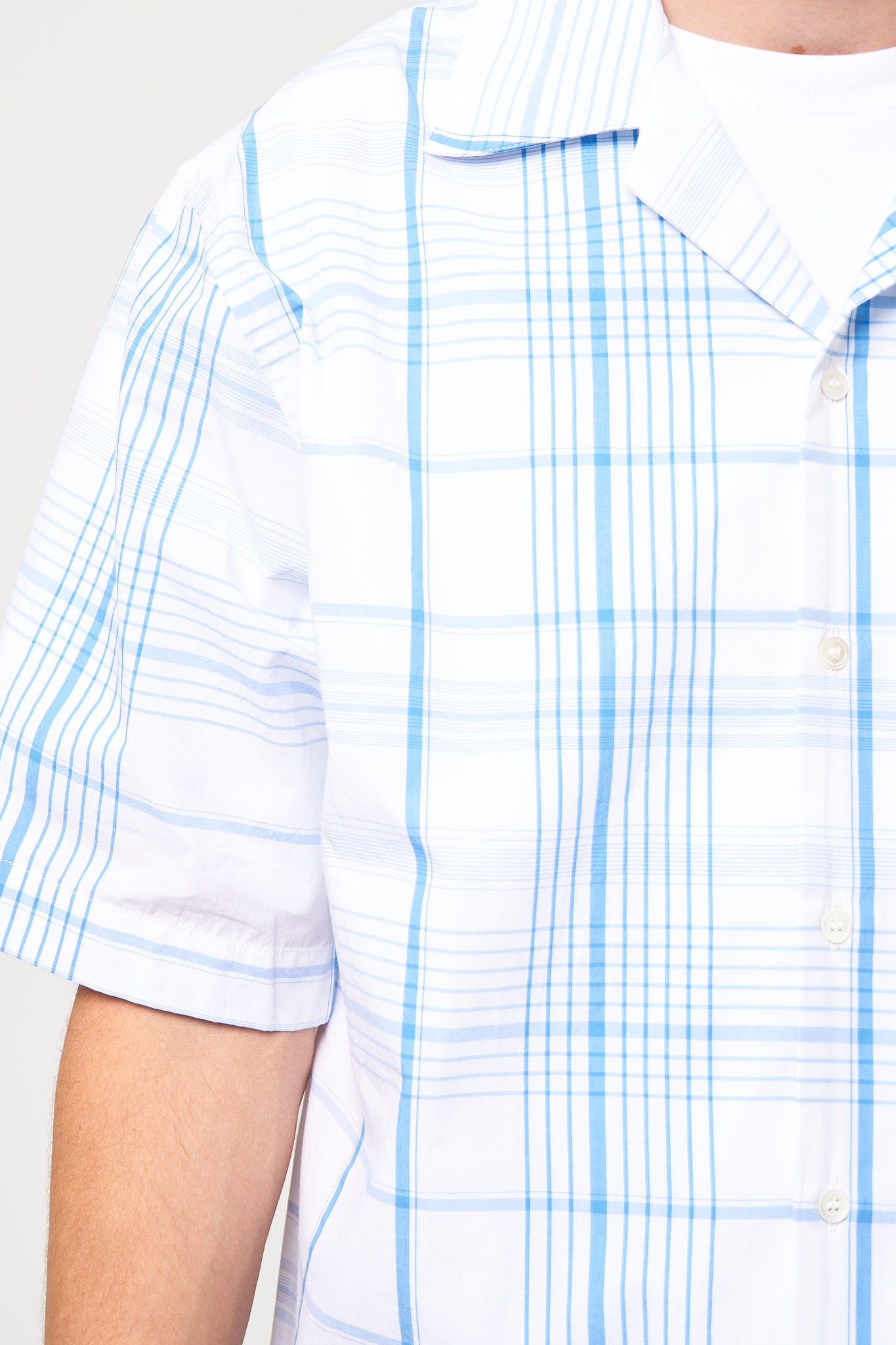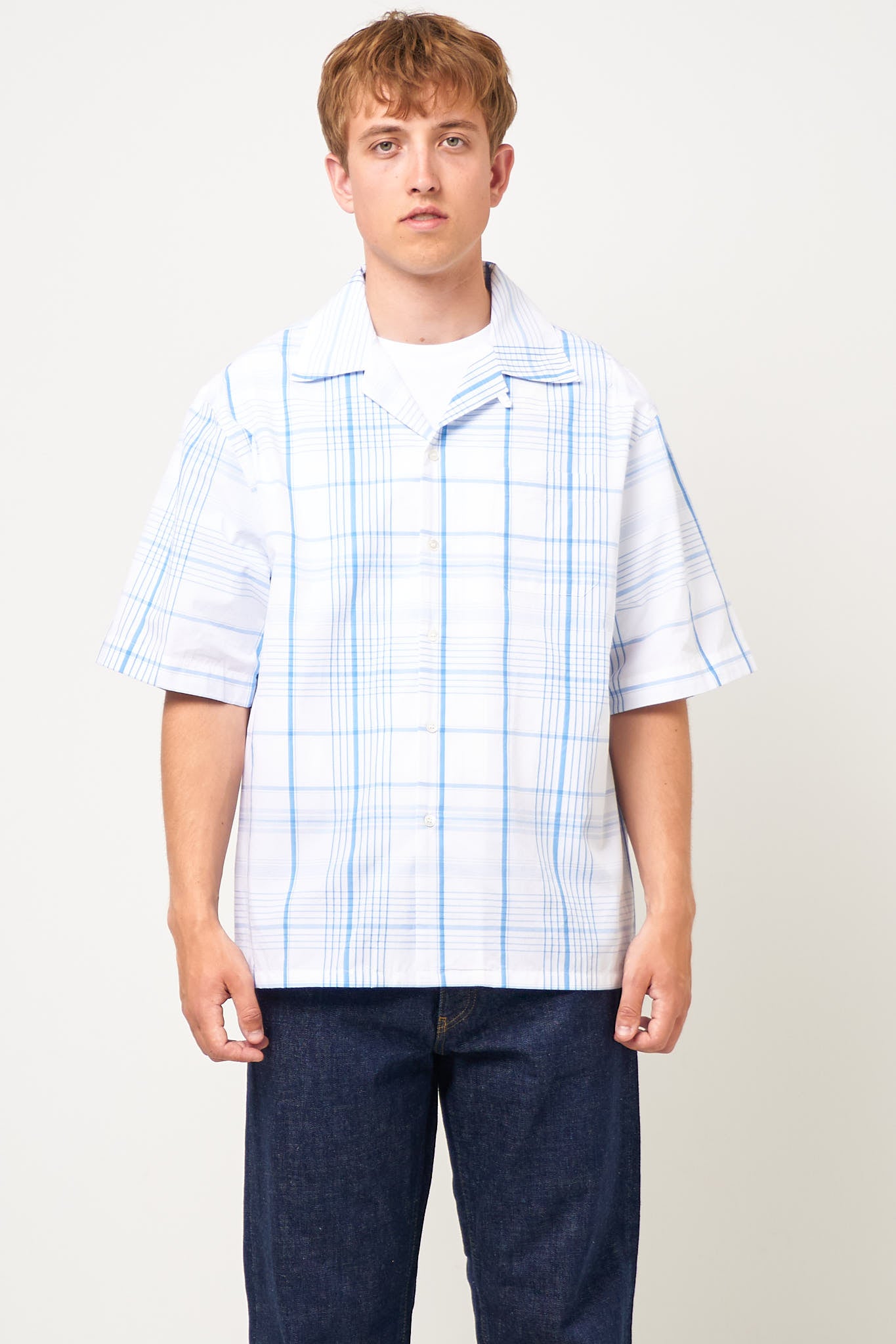 Yarn Dyed Bowling Shirt Lily White from Marni. This shirt is made from a heavy cotton. The shirt has a relaxed fit with short sleeves and an embroidered Marni logo on one shoulder. It has a single chest pocket and closes with buttons.