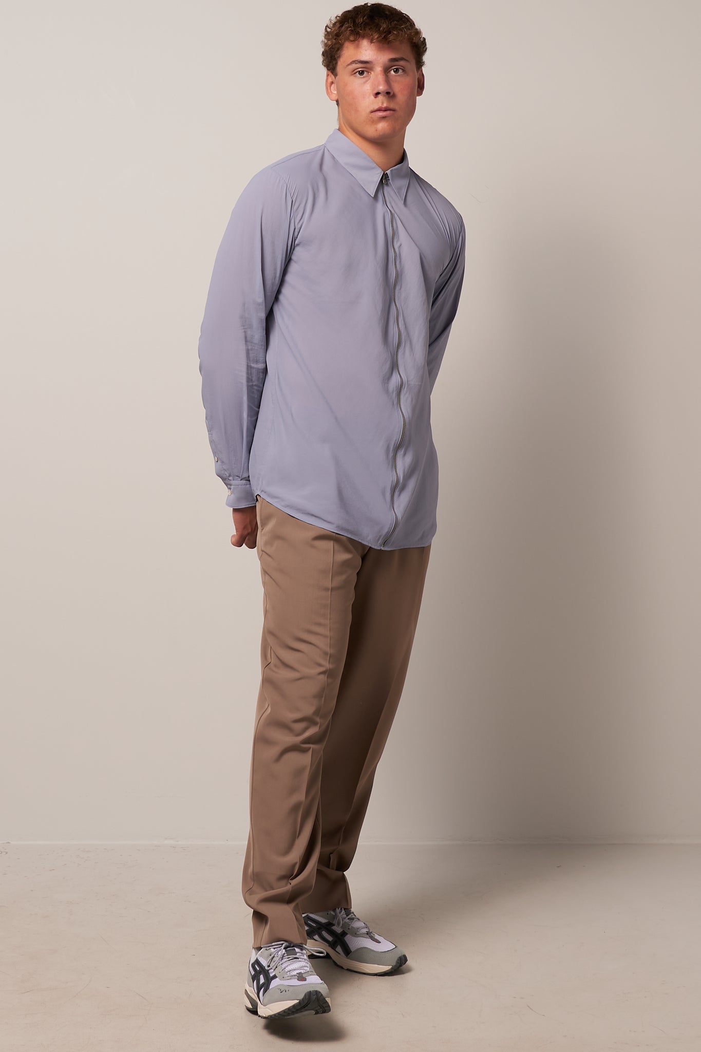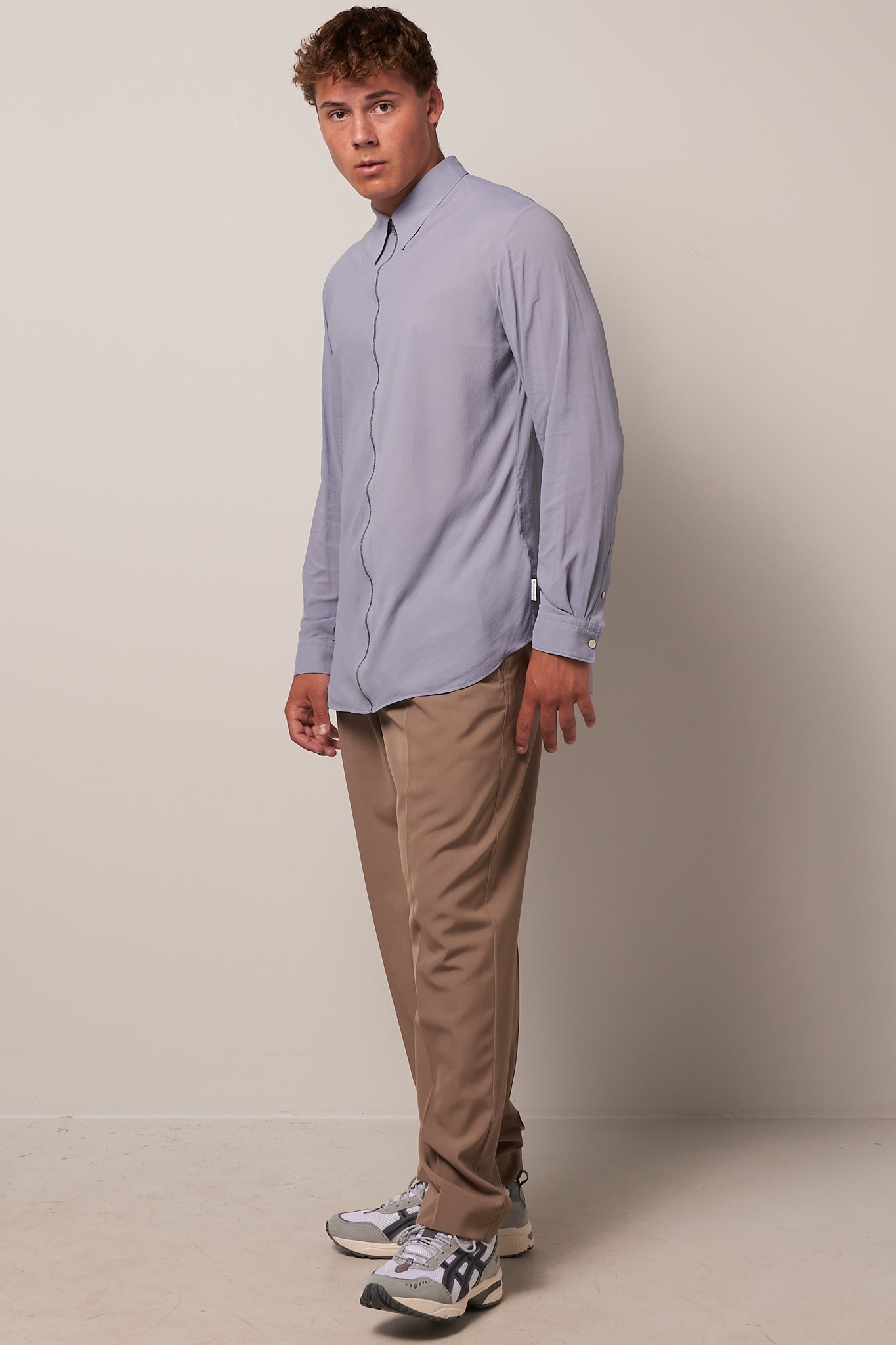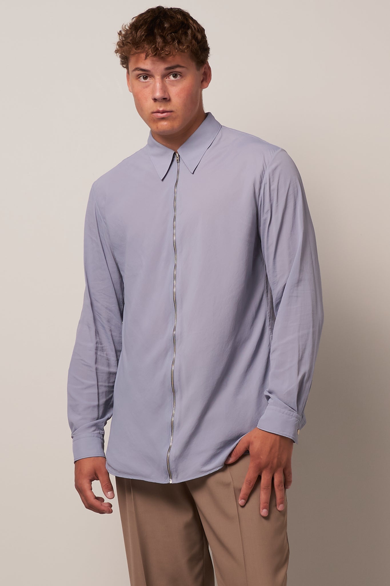 Zip Shirt Dusty Blue by Acne Studios. This shirt is made from a lightweight technical chiffon fabric with a matte finish. The shirt is detailed with a center front zip and has a regular fit.