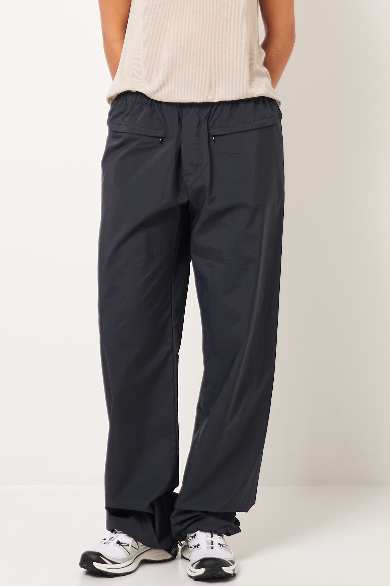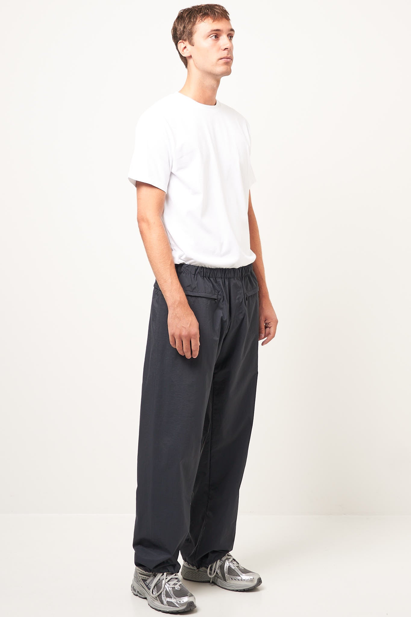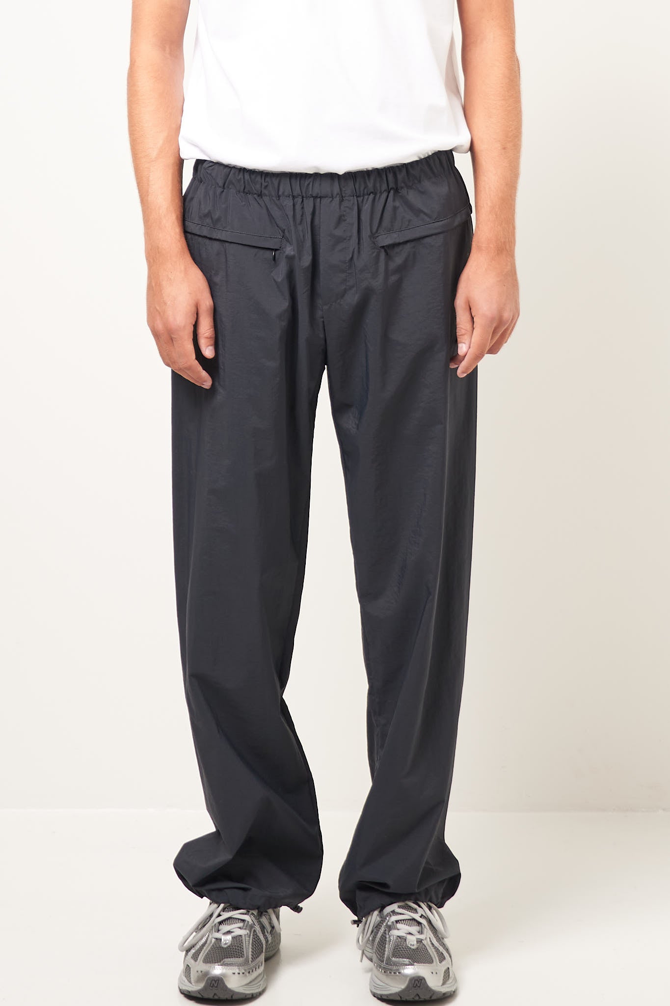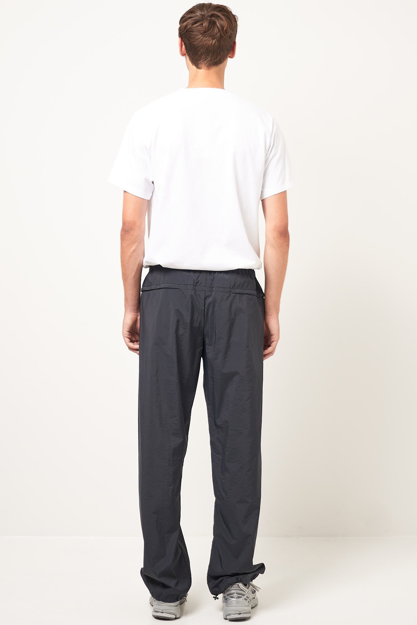 Zip Track Pants Black from STRØM. These pants are made from a lightweight nylon. It is designed in a relaxed fit with an adjustable elastic waist and drawstring legs. The pants are designed with a pocket detail at the hips that closes with a zipper.