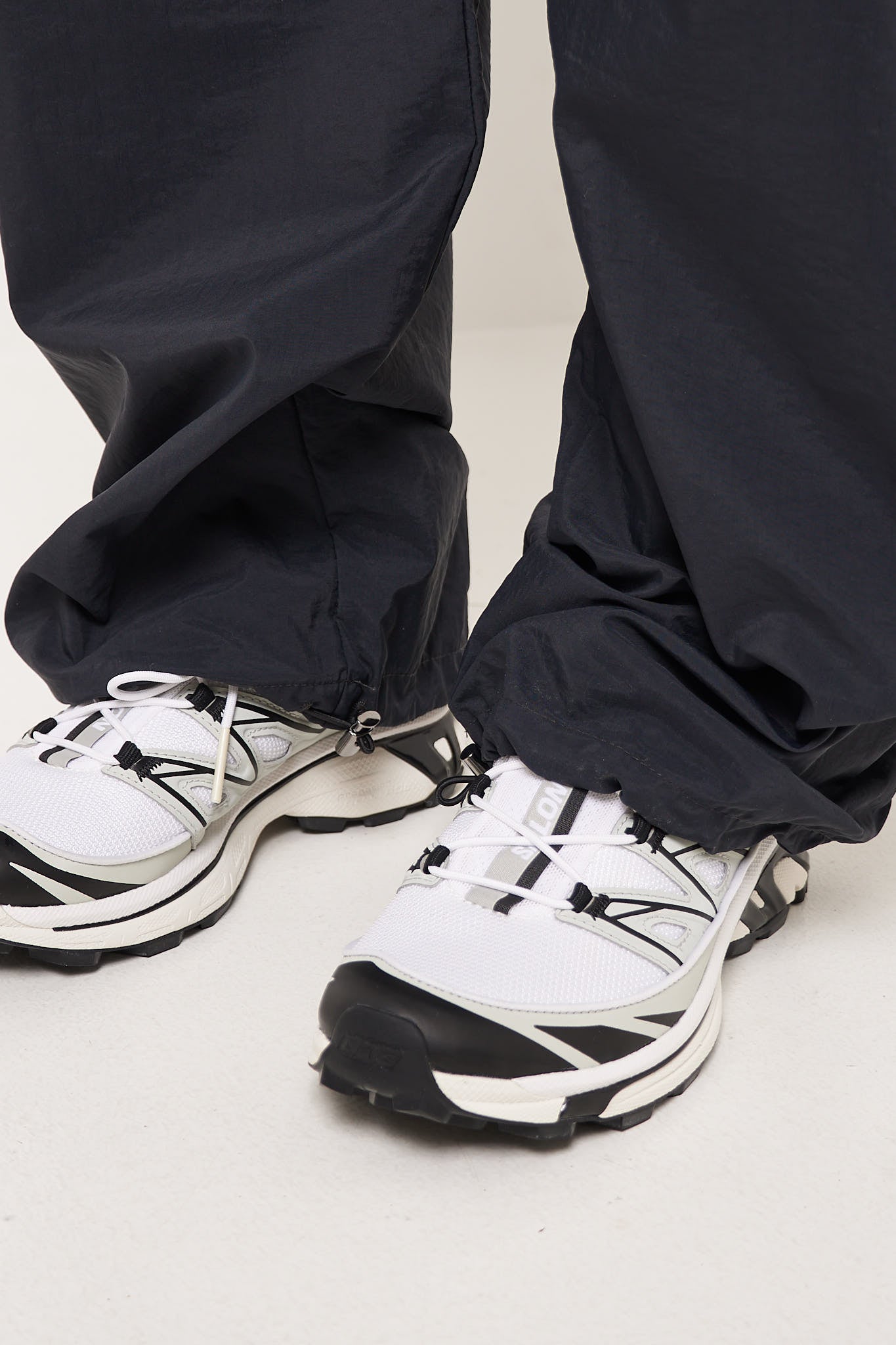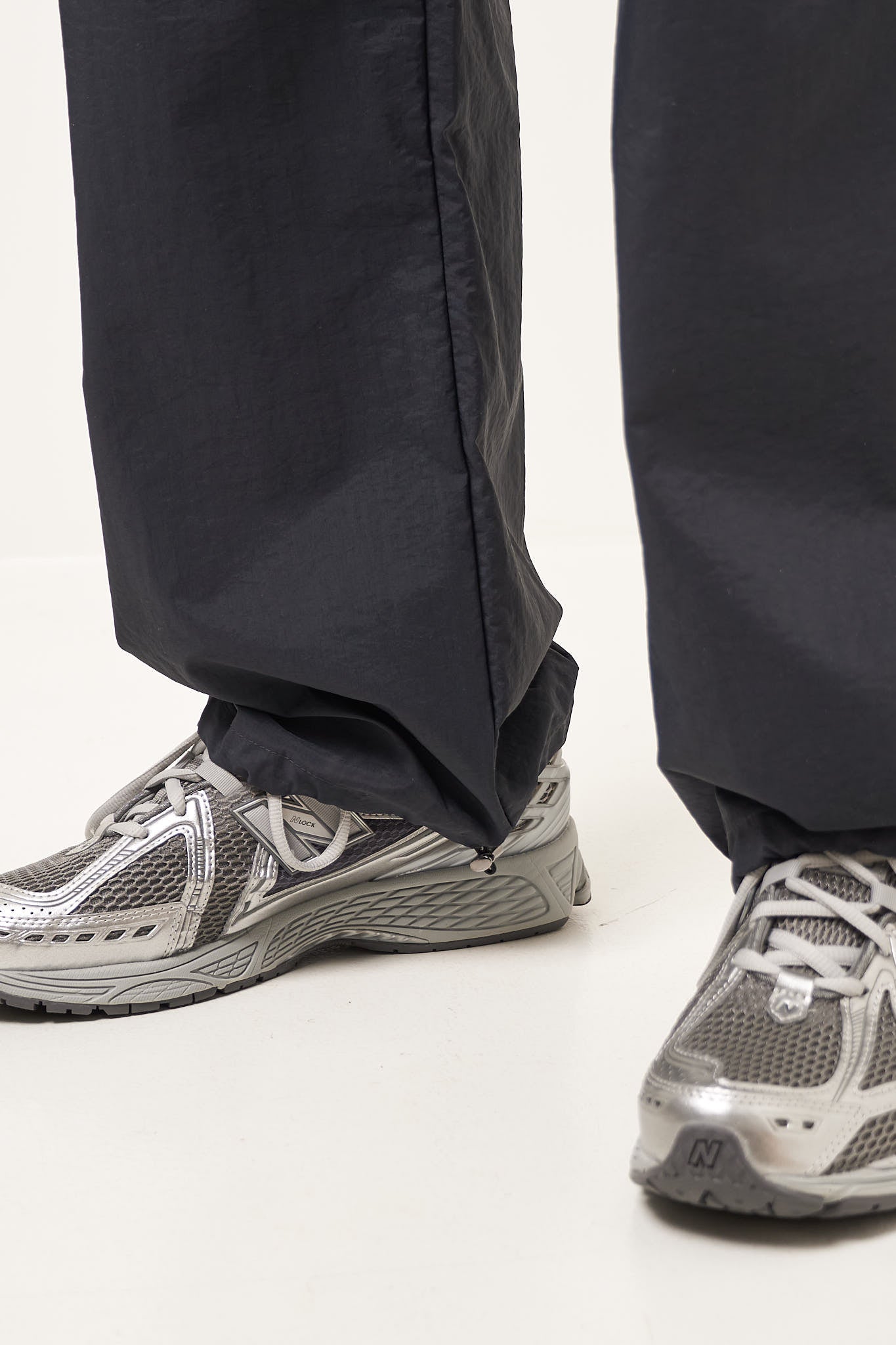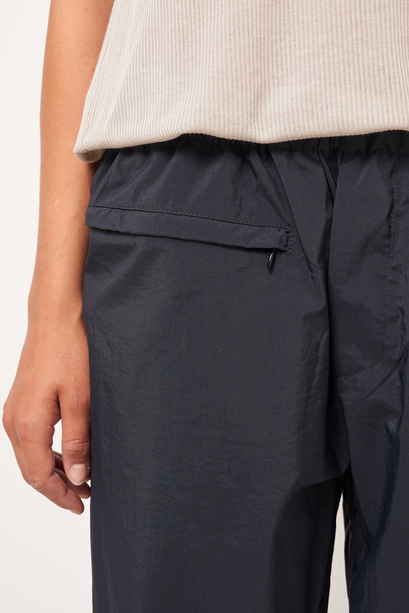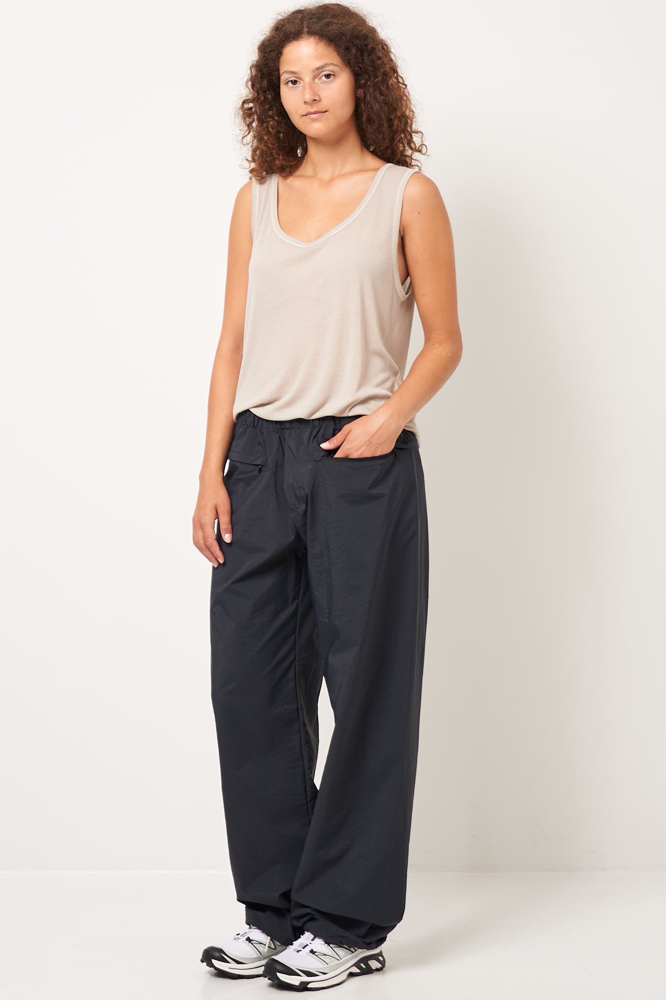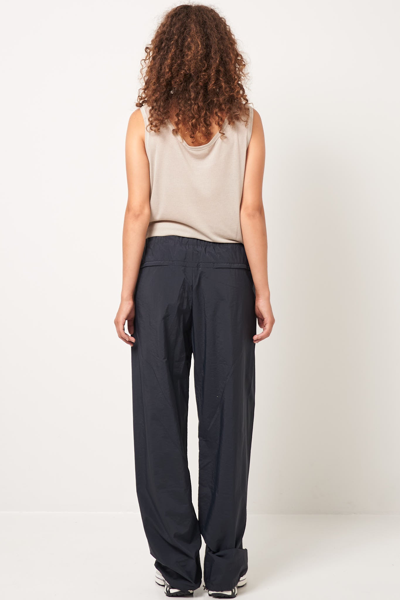 Zip Track Pants Black from STRØM. These pants are made from a lightweight nylon. It is designed in a relaxed fit with an adjustable elastic waist and drawstring legs. The pants are designed with a pocket detail at the hips that closes with a zipper.